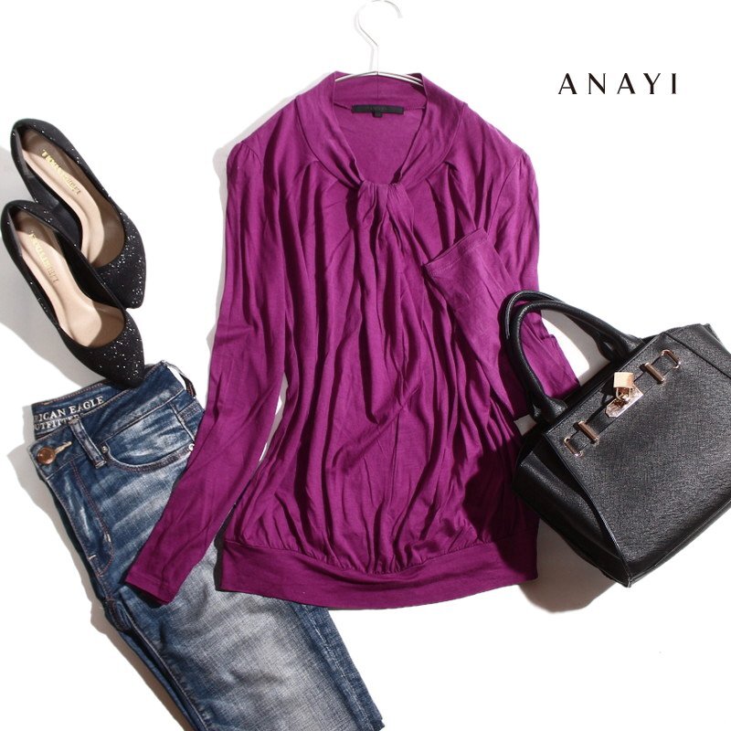 美品 ANAYI アナイ 合物 ウール シルク ギャザー 長袖 カットソー 9号 38 パープル 紫 Tシャツ生地 ミセス オフィス 通勤 綺麗め お洒落