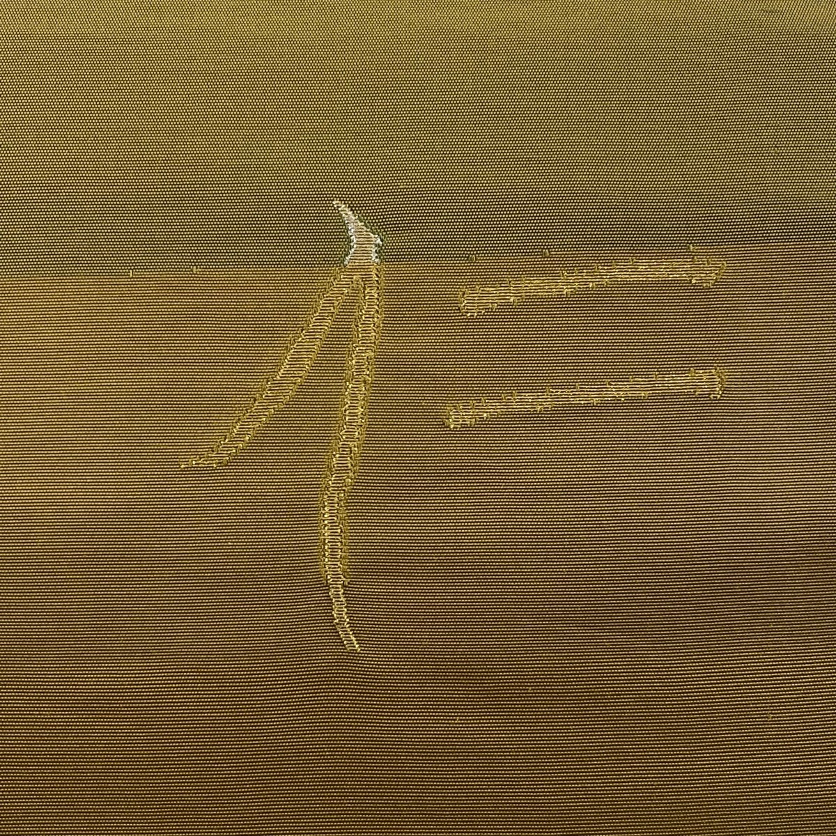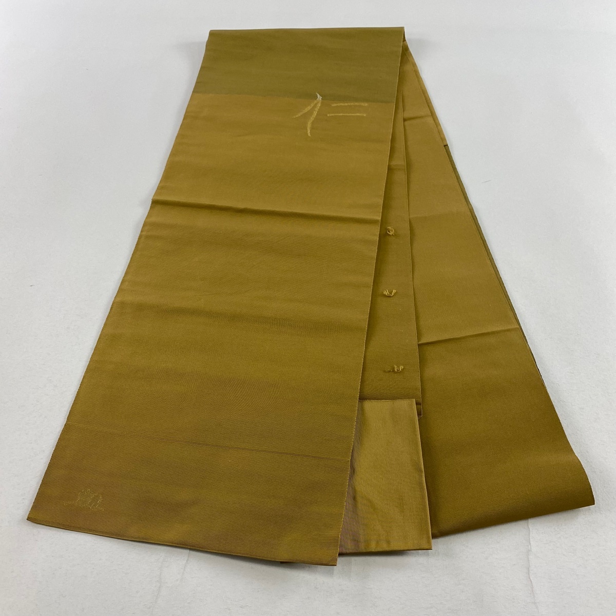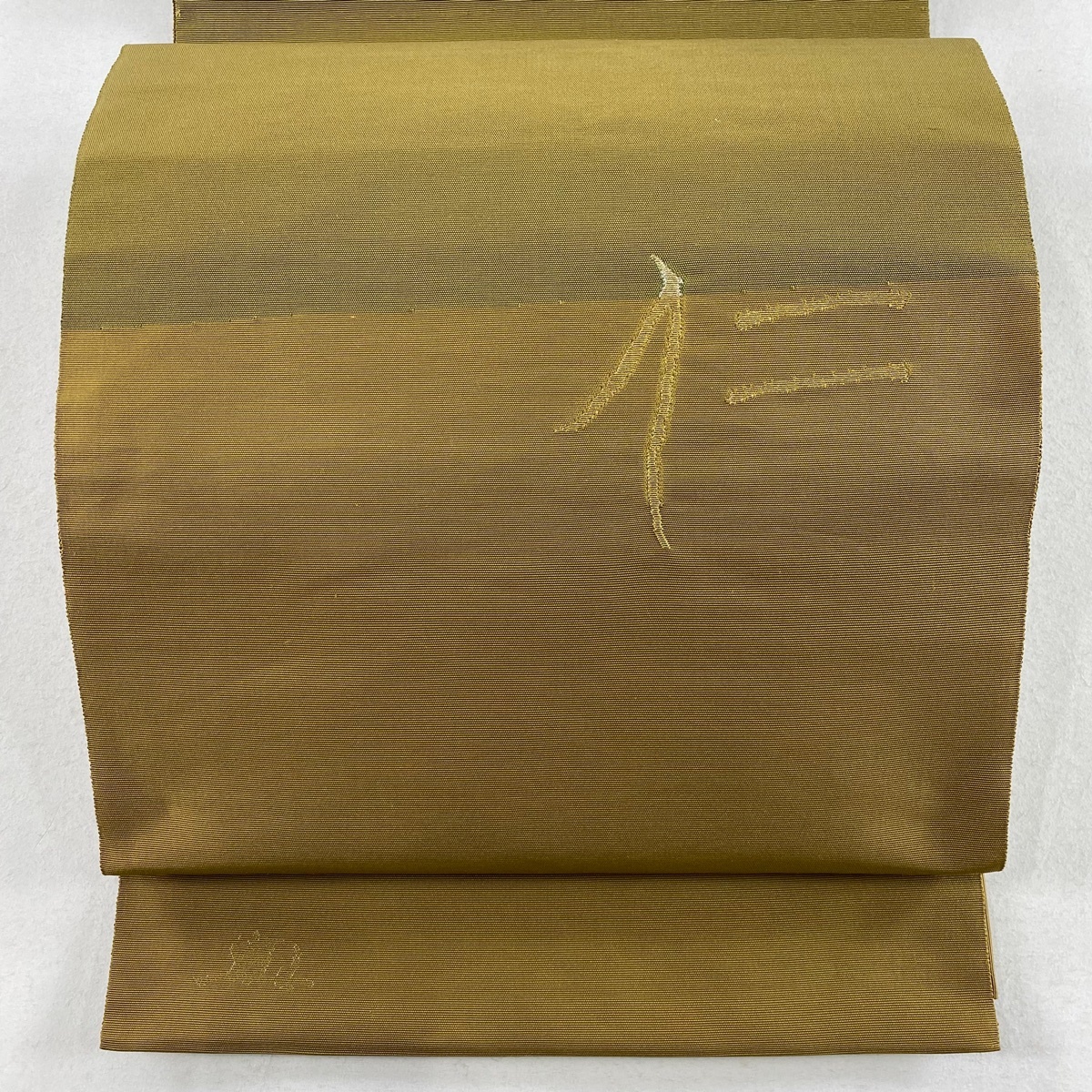 | 名古屋帯 美品 名品 落款 紬地 文字 金銀糸 茶緑色 お太鼓柄 正絹 【中古】 |