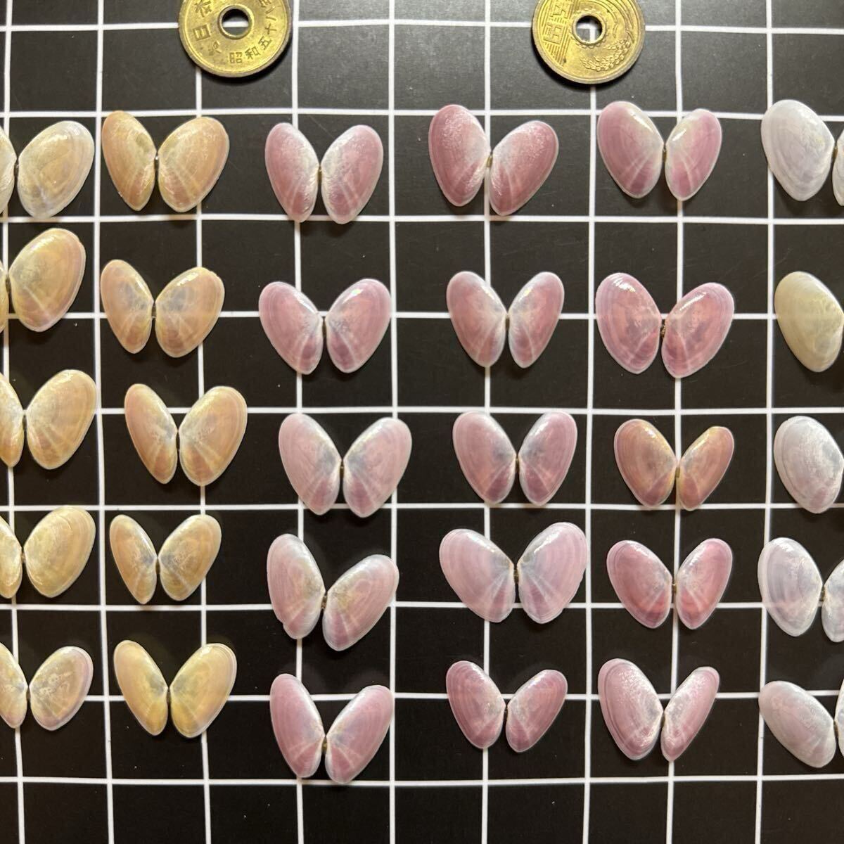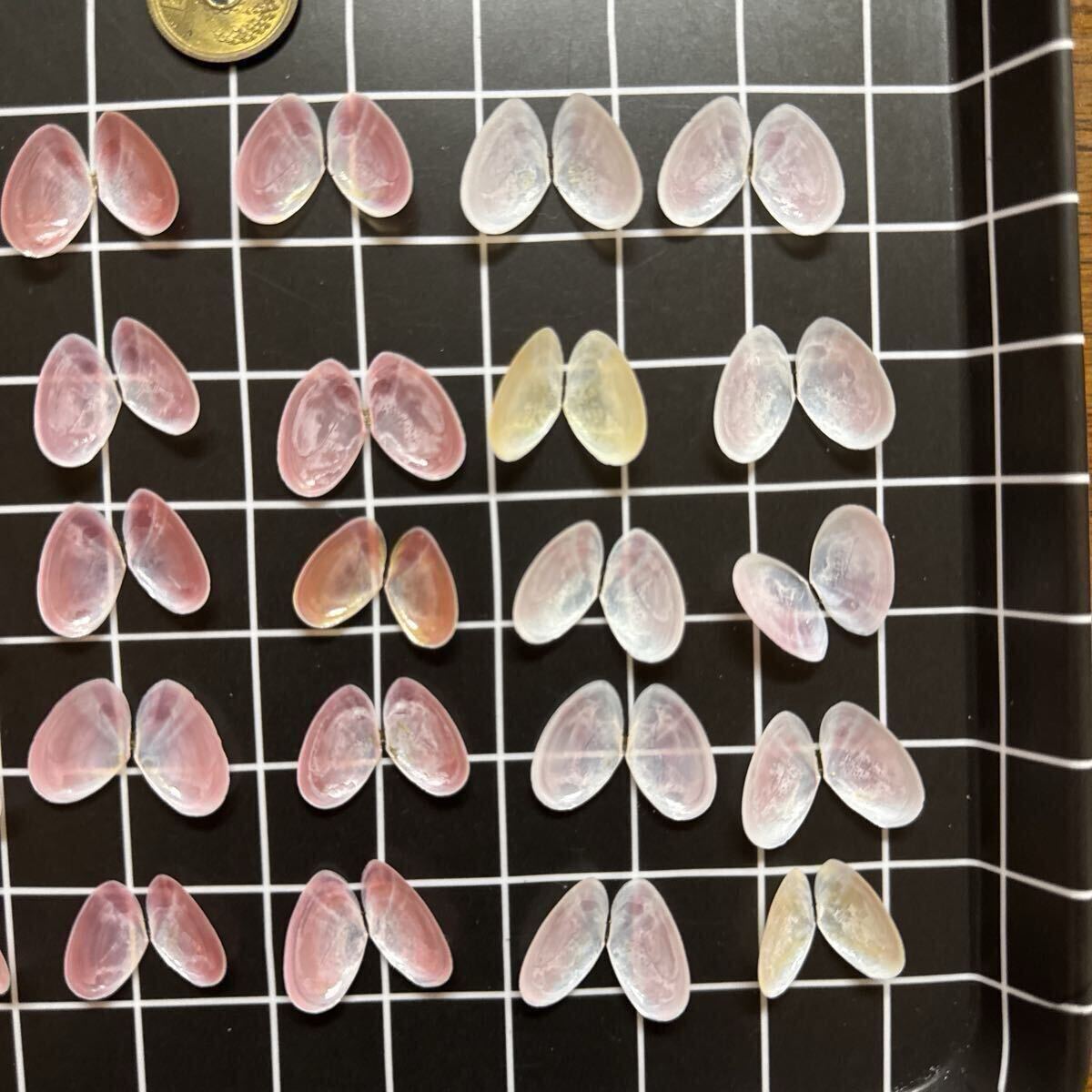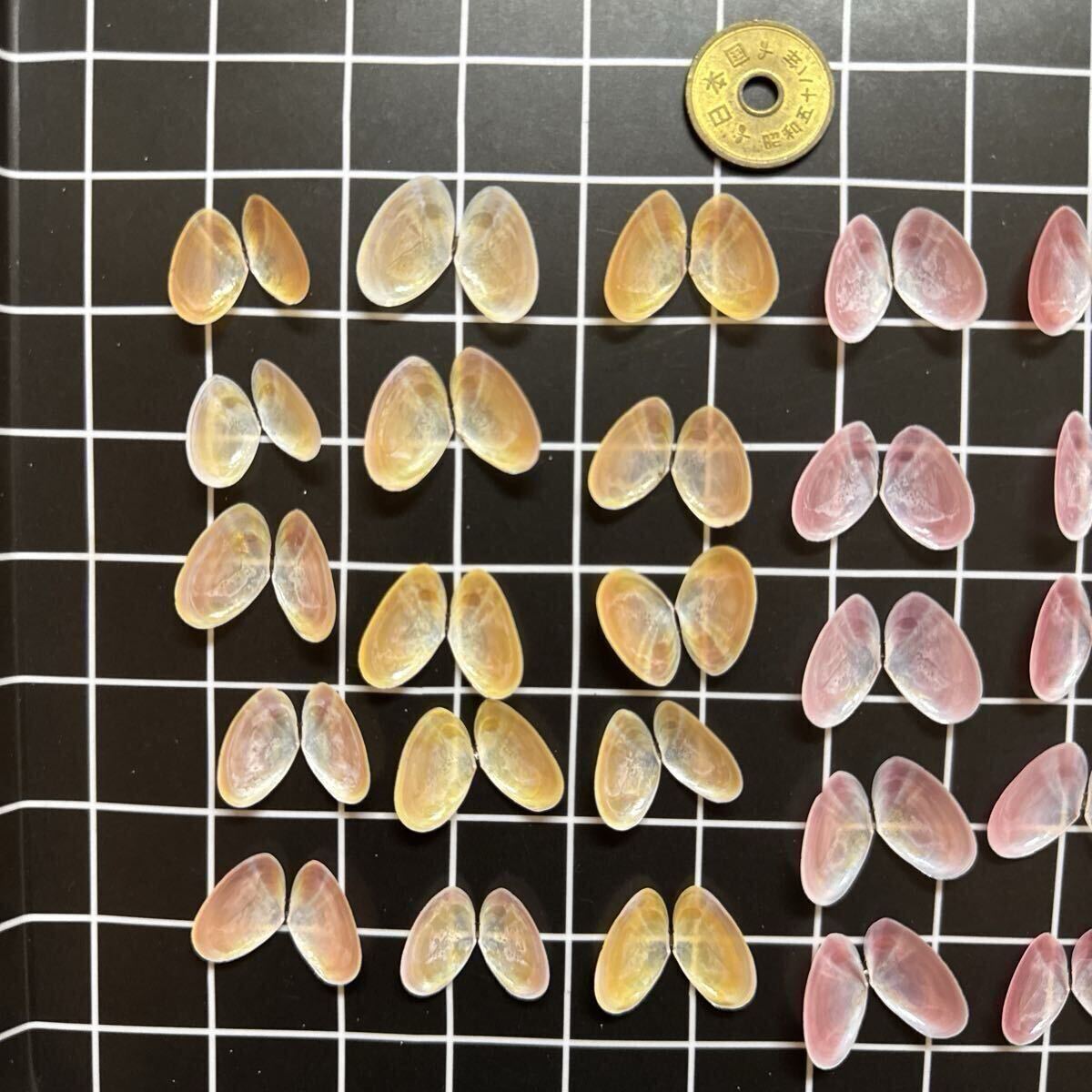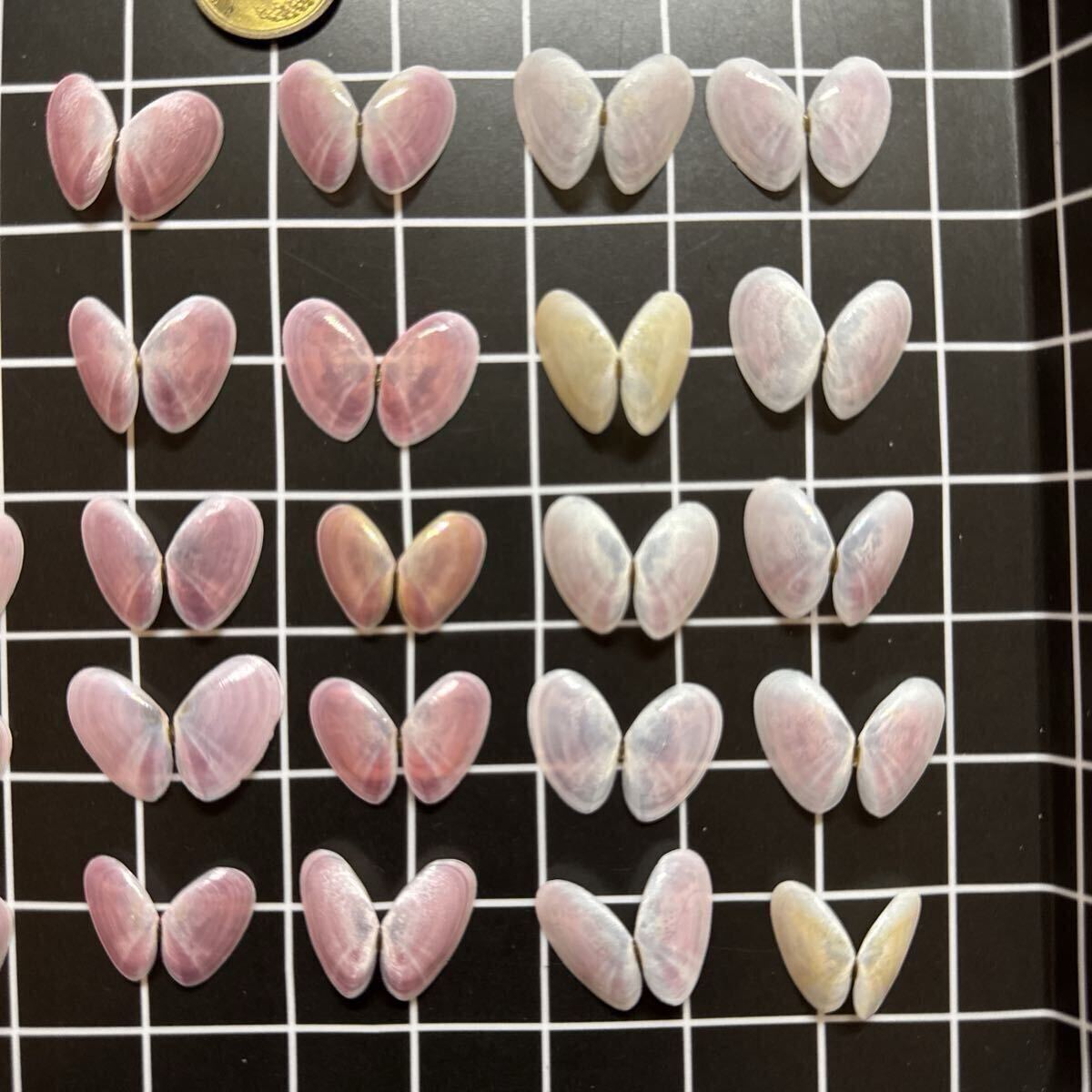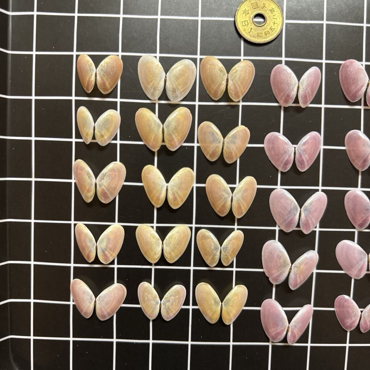 (2025年に拾い集めた桜貝です!やや黄色15蝶番、ややピンク色15蝶番、やや白色10蝶番)