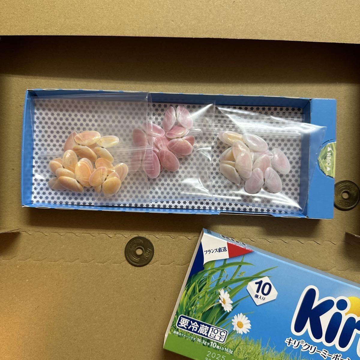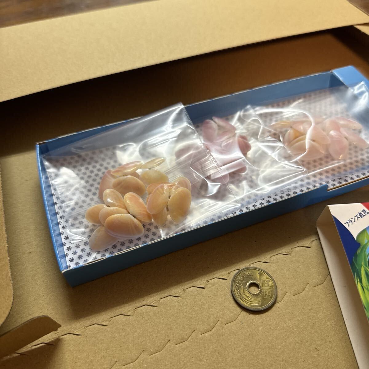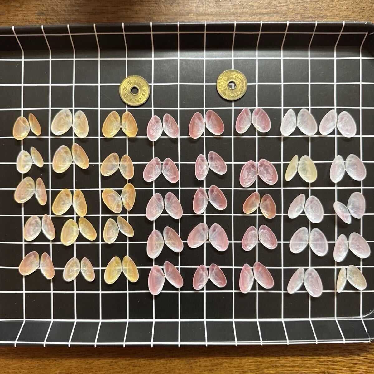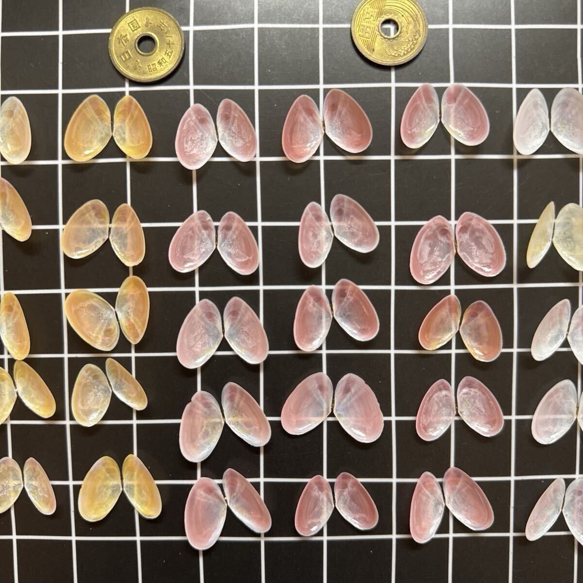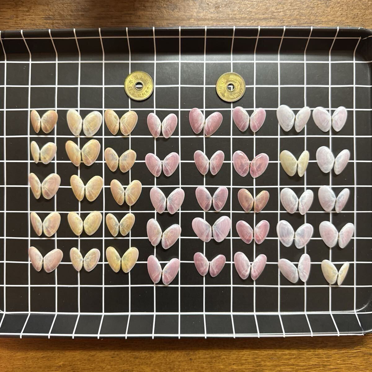 (2025年に拾い集めた桜貝です!やや黄色15蝶番、ややピンク色15蝶番、やや白色10蝶番)