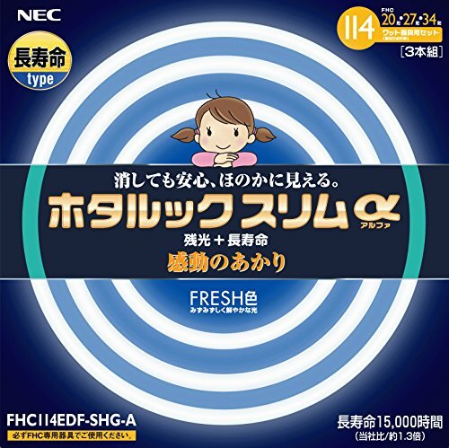 ・ホワイト FHC114EDF-SHG-A・:単品・メーカー型番:FHC114EDF-SHG-A・サイズ : 管径16mm×外径225mm、管径16mm×外径299mm、管径16mm×外径373mm・重量 : 80g、105g、135g・20W+27W+34W3本パック・定格平均寿命 : 15 000h・光色 : 昼光色相当・口金 : GZ10q・残光機能付き残光:消しても安心、ほのかに見えるスイッチを切った後でも暫くの間、淡いブルーグリーンのほのかな明かりが残るので、お子様にも安心して眠っていただけます。また突然の停電時にもお部屋がすぐに真っ暗になることもなく、「安心・安全・便利な機能」です。口金 : GZ10q。