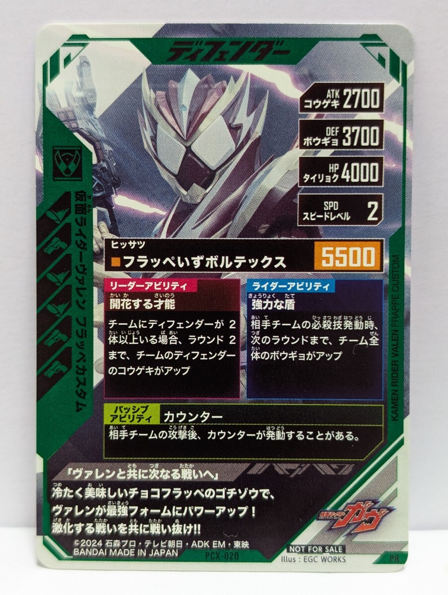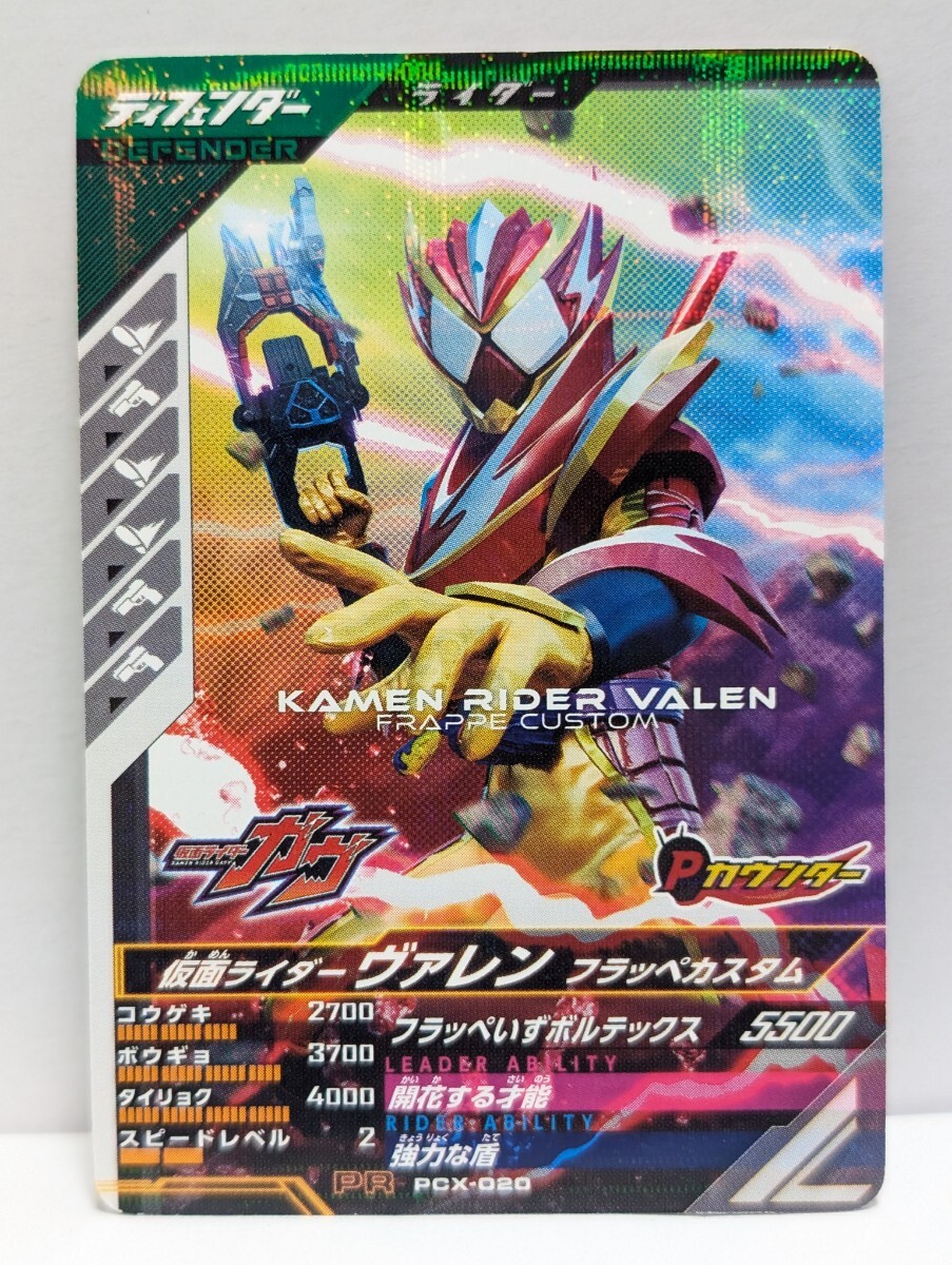「仮面ライダーバトル ガンバレジェンズCX3弾 仮面ライダーヴァレン フラッペカスタム(PCX-020) 店頭配布」を出品します。「おまとめ」可能な方は4枚までミニレター送料85円でお取扱いできます。5枚以上の場合は定形郵便で送料別途計算となります。