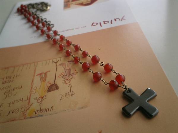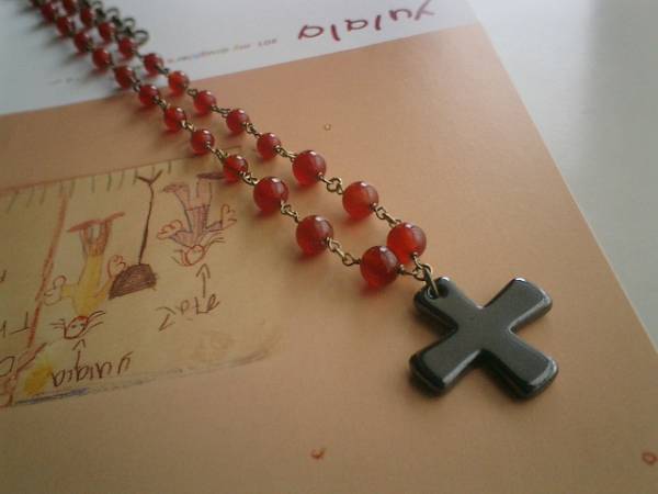 アート・ロマン主義・・シリーズです♪シックなクロスに恋して・深い赤のレッドアゲートとヘマタイトのクロスのネックレスです♪さりげなくパンクしています♪レッドアゲートは6ミリと8ミリの丸玉です♪トップのヘマタイトのクロスは30ミリ位です♪デザインチェーンを合わせてキュートモダンな表情です♪長さは77センチ位で調節自由です♪お揃いのブレスレットも出品しています♪シンプルで飽きのこないいつまでも着けられるデザインを考えて作りました!ハンドメイドをご理解頂いてノークレーム、ノーリターンでお願いします