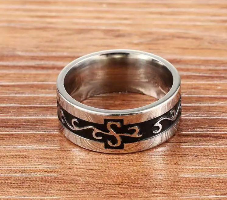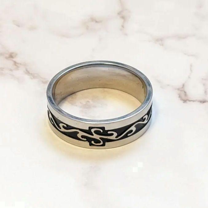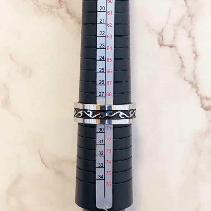 このリングはステンレス製で、中央にブラックの装飾が施されたシンプルなデザインです。光の加減でキラキラと輝く美しさが魅力的です。