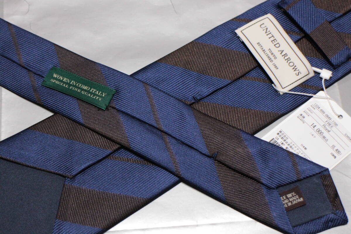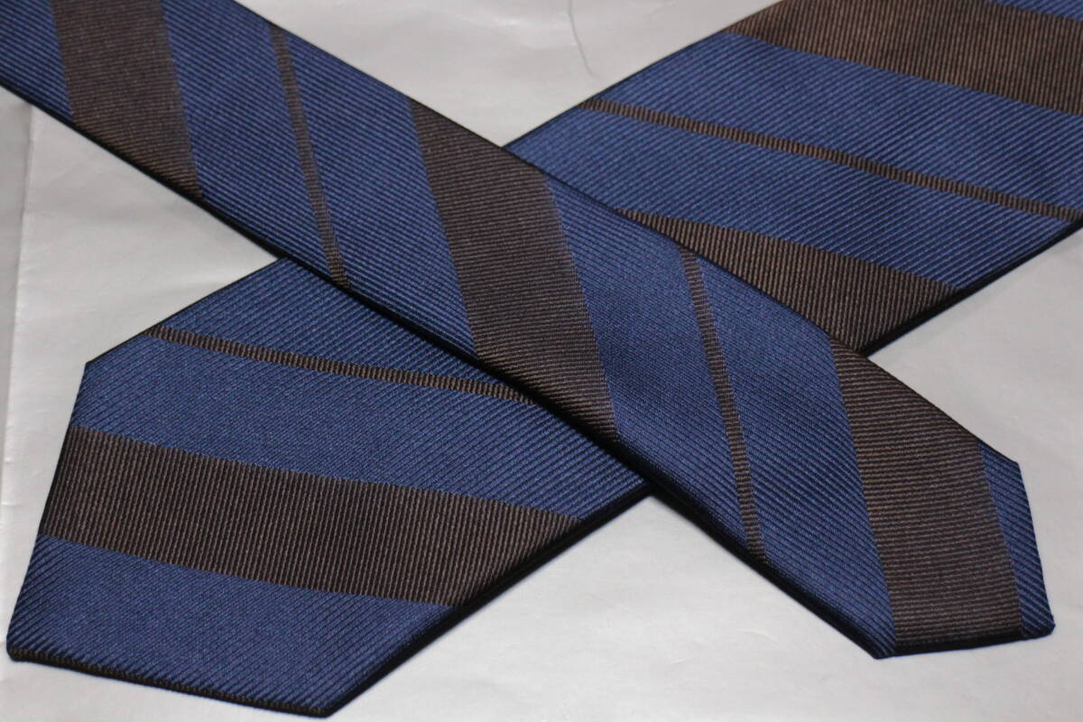 ユナイテッドアローズ*カネパ新品ネクタイ超シック艶ブルー*ブラウンレジメンタル重厚ツイル織ワイドピッチブロックラインハンドメイド