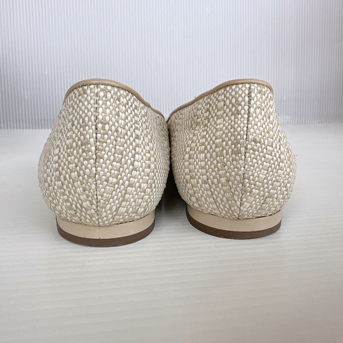 大きなスクエアバックルを飾ったエレガントな雰囲気のフラットシューズ。