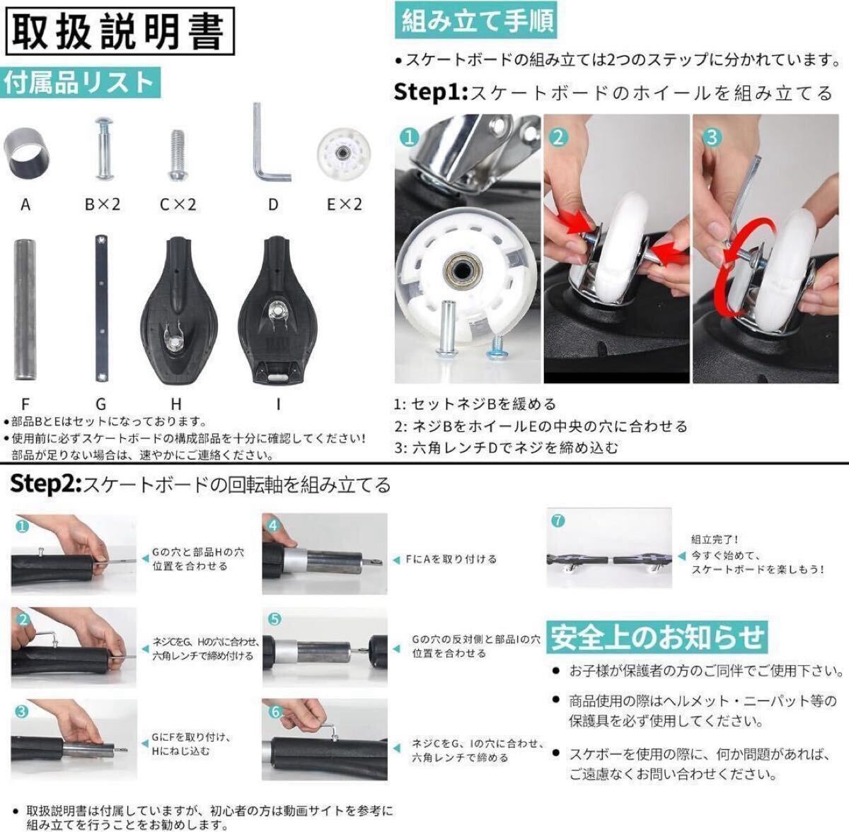 スケボーの組み立てに必要な部品を事前にチェックしましょう。取扱説明書は付属していますが、初心者の方は動画サイトを参考に組み立てを行うことをお勧めします。初心者むけ、最大耐荷重約60kgとなり、安定性と安全性があり、耐久性も優れ、子供から大人までも適用されるスケボーです。