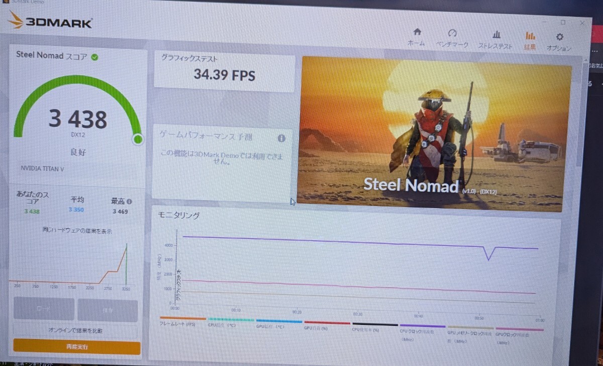 ・3DMark Steel Nomad:Score 3438(写真参照)