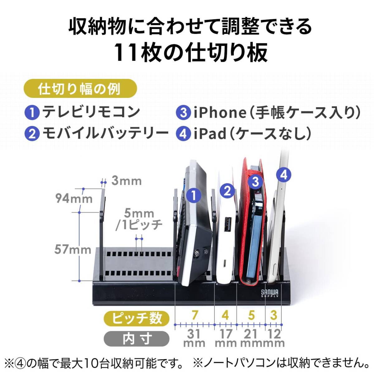 設置機器に合わせて仕切板の取付位置を自由に調整できる、最大 10台 までの設置に対応した スマホ タブレット 収納スタンド です。