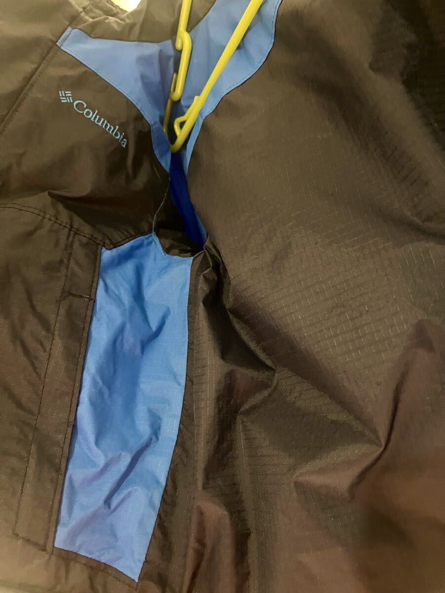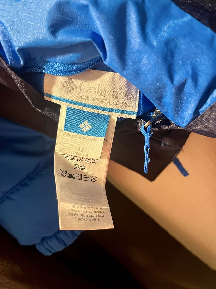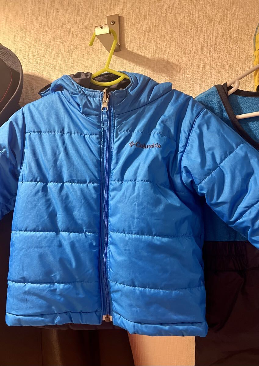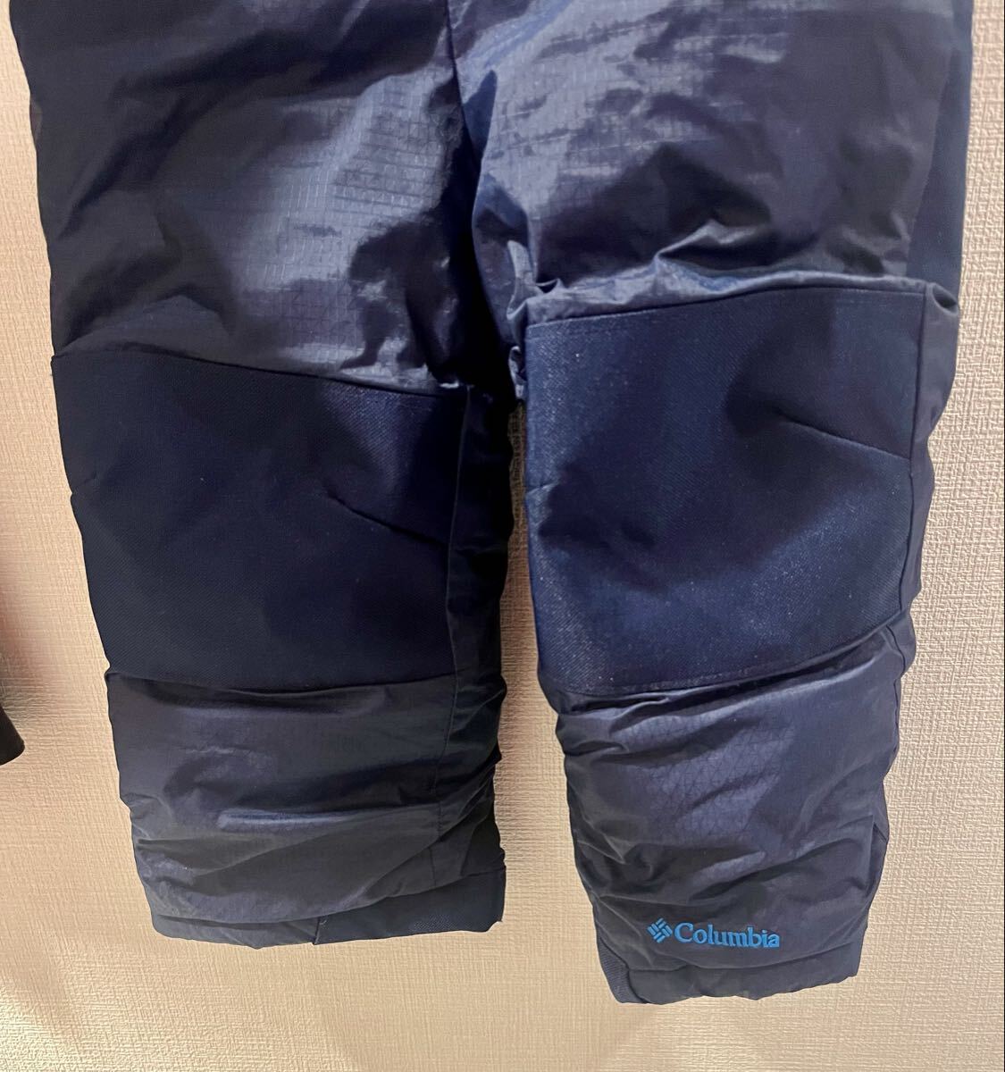 青色のColumbia製防寒リバーシブルジャケットとオーバーオールのセット。