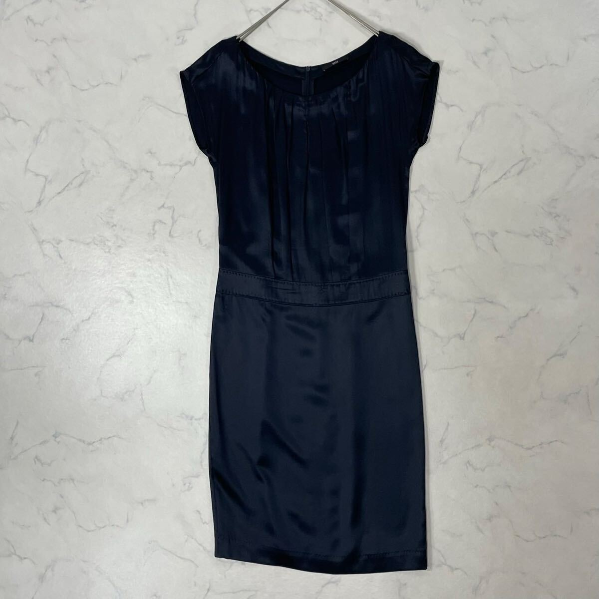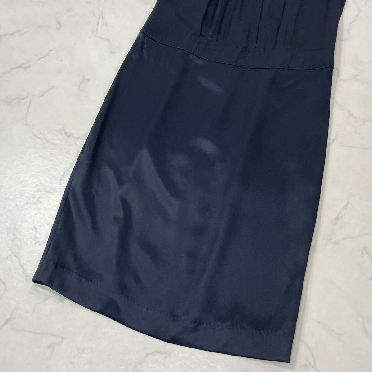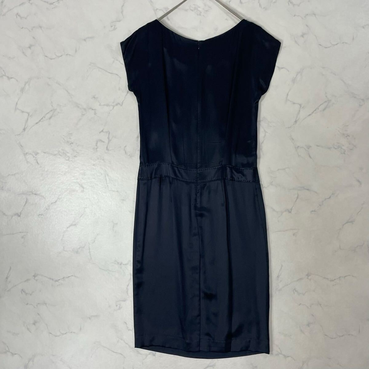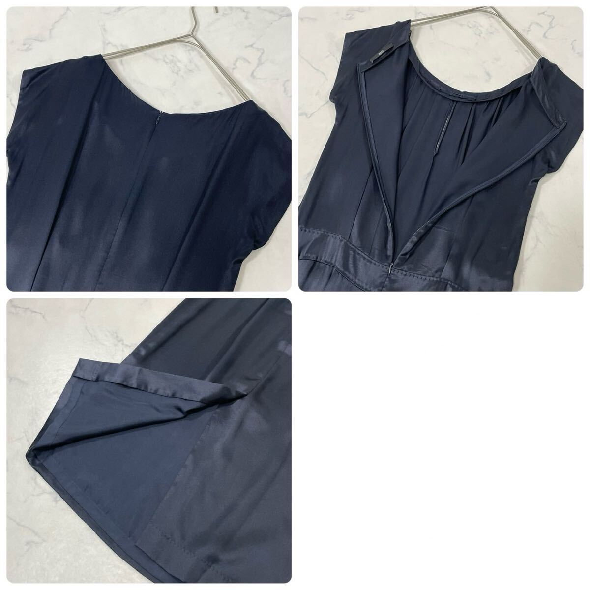 切替 ワントーン 裏地付き タック ベンツ ジップ シルク クルーネック フレンチスリーブ ひざ丈 ワンピース