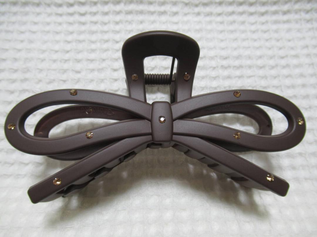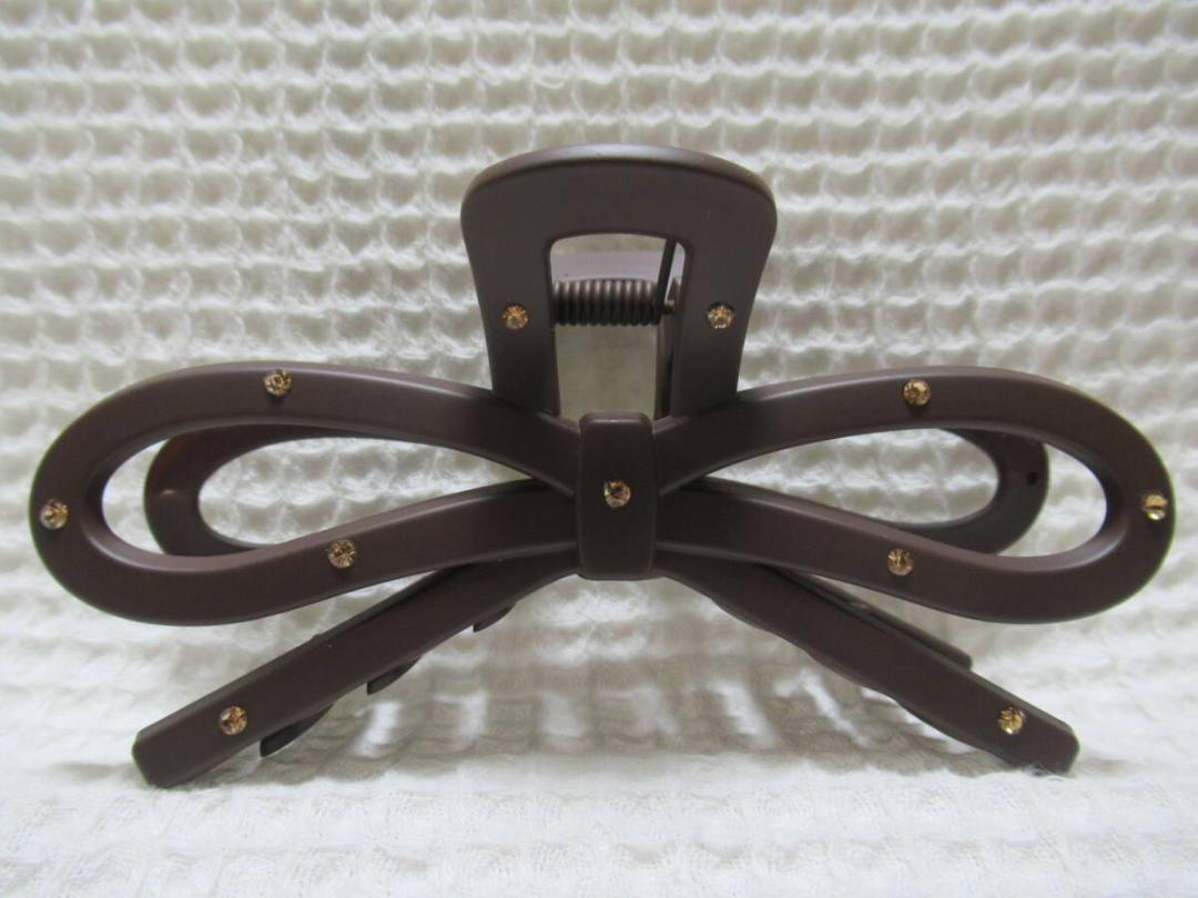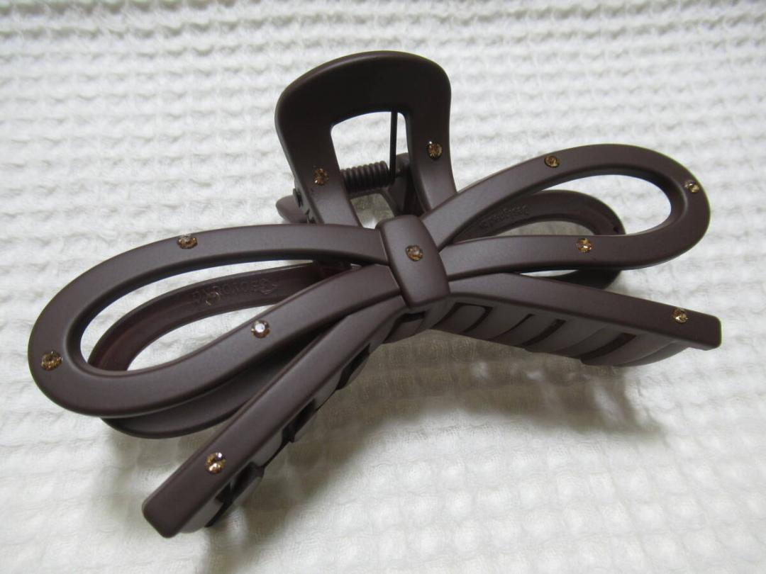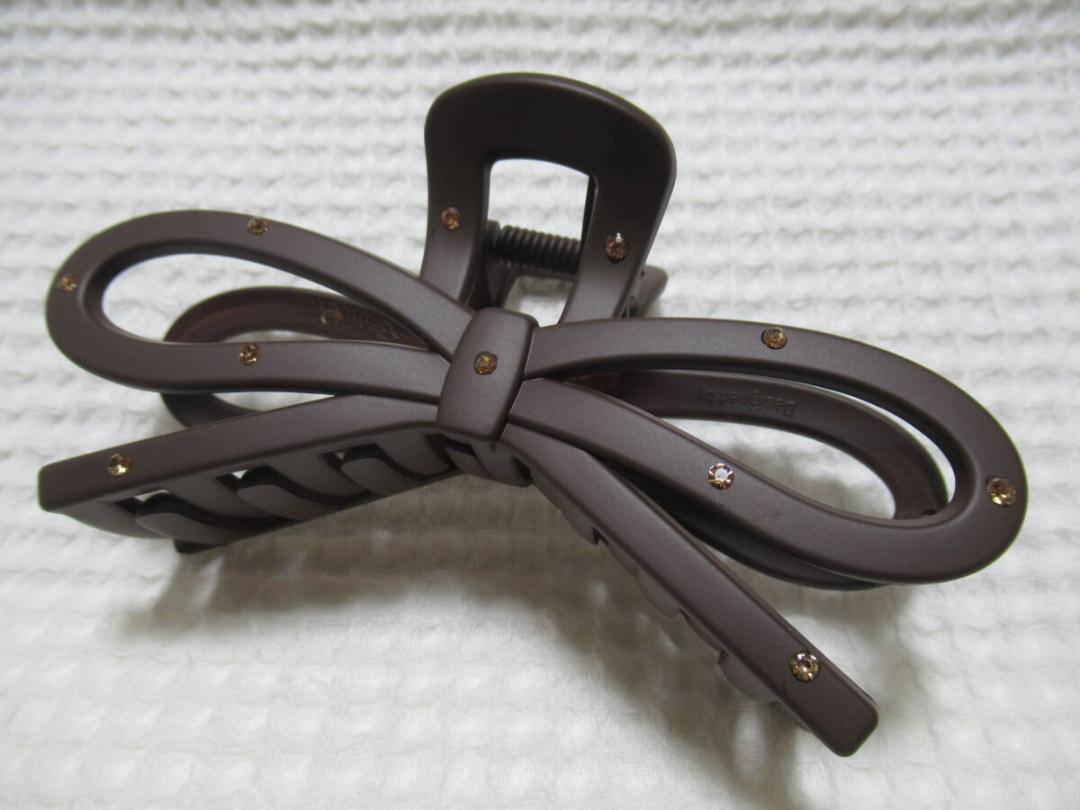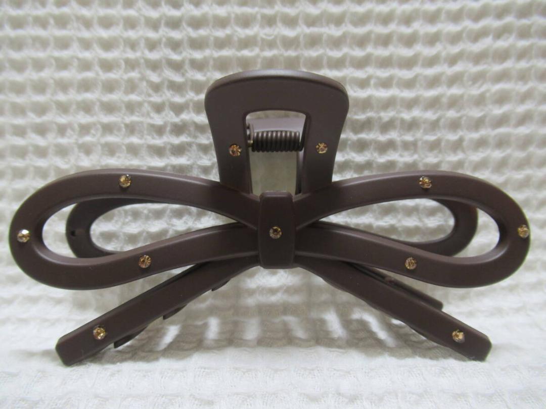 ラインストーン付き 樹脂製リボン型バンスクリップ ブラウン系