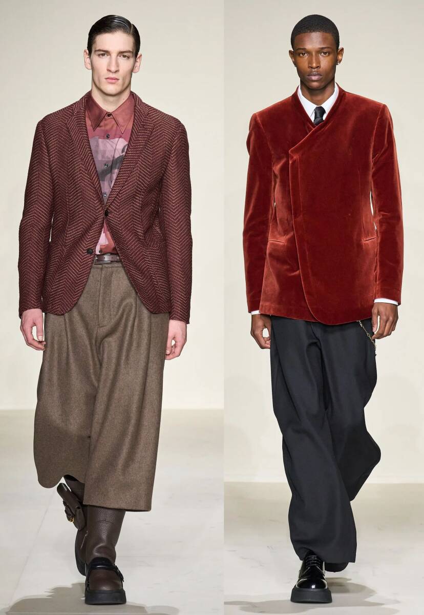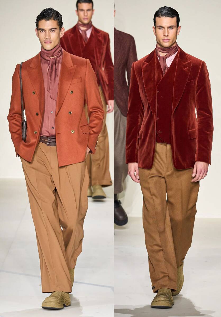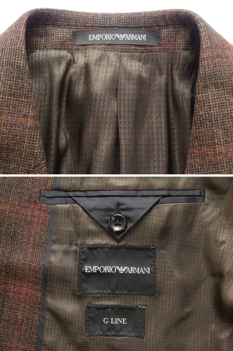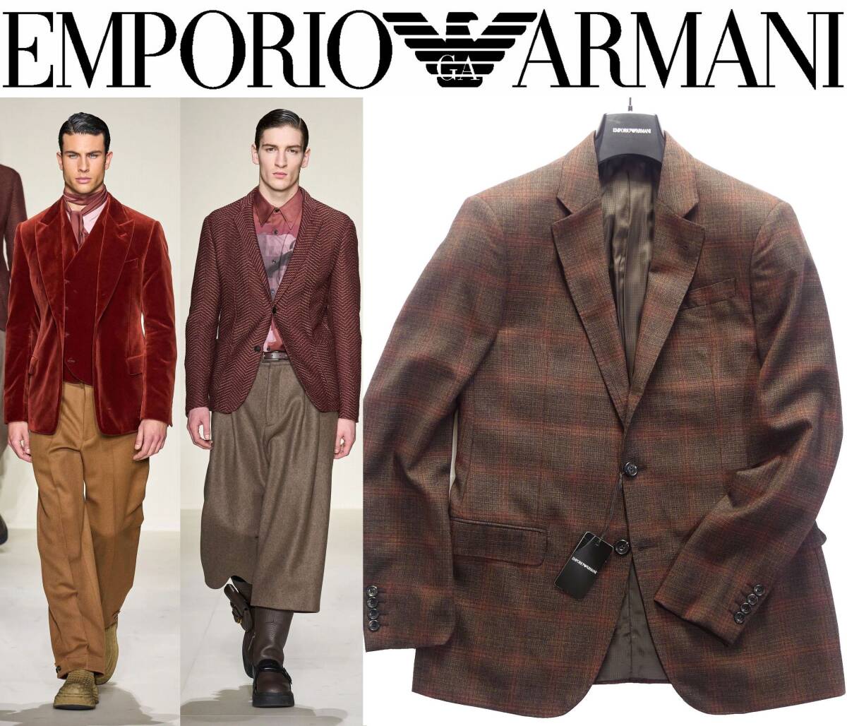 ソフトツイードのような柔らかい甘織りでしなやかな質感の起毛生地。秋冬向けの本格テーラードブレザーです。さすがの20万円越え、相当に質の良い高級生地を使用しています。洒落たチェックの織り柄はビジネスシーンにも十分に対応する落ち着いた色トーン。濃紺やチャコールのダークカラースラックスを合わせてシックにまとめたい気分です。今回のエンポリオのコレクションは出品のジャケット以外にも茶系が多く、特に気になったのは赤味を帯びたブラウンを多用しているところです。今回のブレザーも同様にレンガ色のような赤茶のニュアンスがあり、具体的には茶色にボルドーの糸を混紡しています。ご覧のとおり通常の茶系よりもリッチで温かみがあり、少し華やかな印象です。もちろん派手なトーンではなく落ち着いた色合いですのでビジネスシーンにも十分に馴染みます。コレクションランウェイから抜粋しましたモデルルック4つは、今回のジャケットをどのように着こなすかのイメージヒントとしてわかりやすい例と思います。ベージュや茶色など同系色でまとめればリッチ度が増す華やかなルックになり、紺やグレージュのような落ち着いた色を合わせれば華やかな印象は薄れ、大人シックな印象になります。靴の色も前者と後者で真逆のトーンを合わせているところも注目です。
