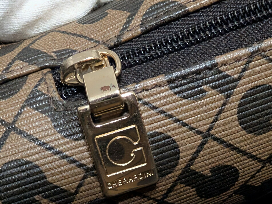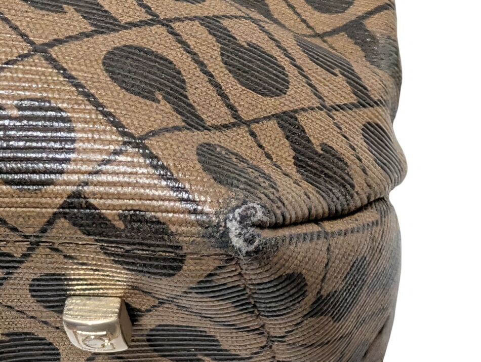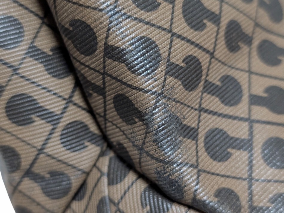 状態・・・ 正面のロゴ金具に小傷やくすみがあります。バッグ本体に少々のスレや小傷箇所があります、背面の下方に薄っすらと黒ずみ箇所がります。四隅に剥げ、底鋲にスレや小傷があります。ハンドルやバッグの開口部付近のレザー使用箇所にスレやキズ箇所があります。開口部にスレ、内側に薄汚れや黒ずみ箇所があります。バッグ内部は綺麗な状態です。