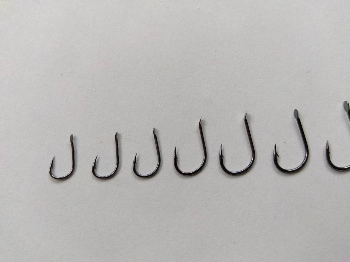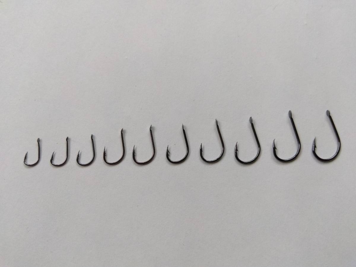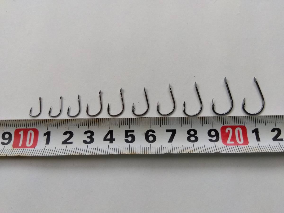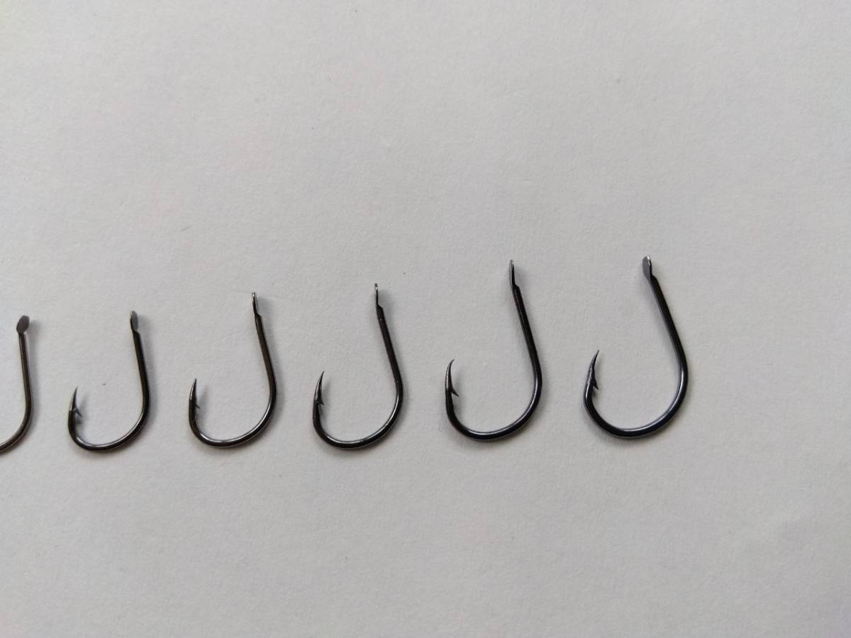 最も大きい針だと、チヌ・グレ・ブラックバス・トラウト(マス)を狙うような針になります。