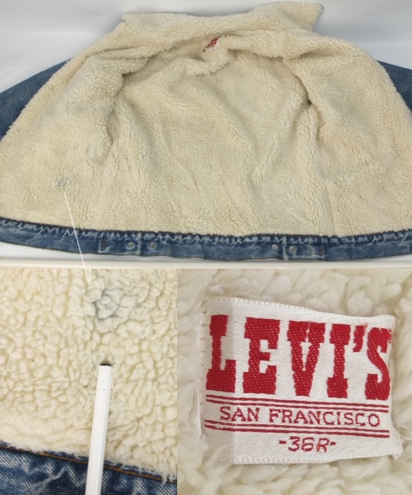 裏ボア、型番の違いか経年による黄ばみかもしれませんが、白ではなくクリーム色です。右のお腹の裏ボア、青っぽいシミ