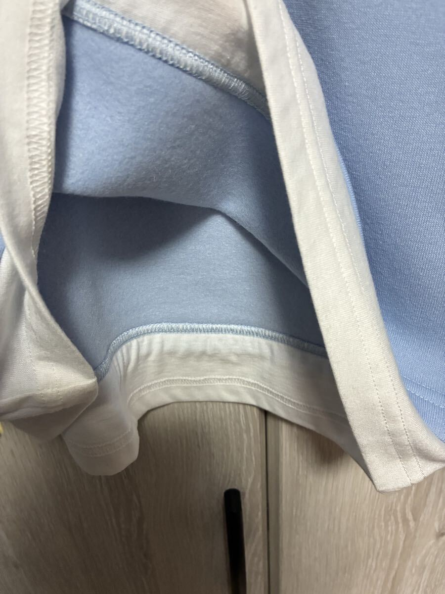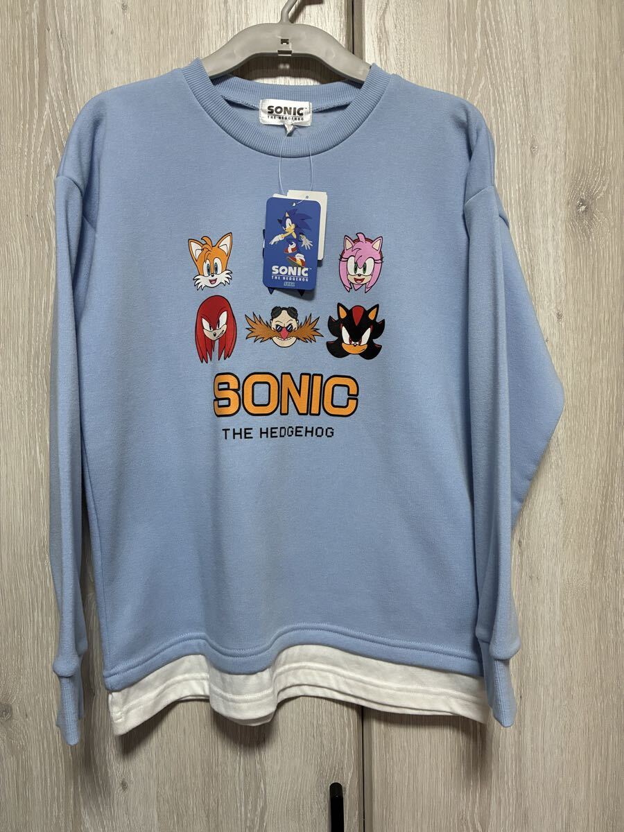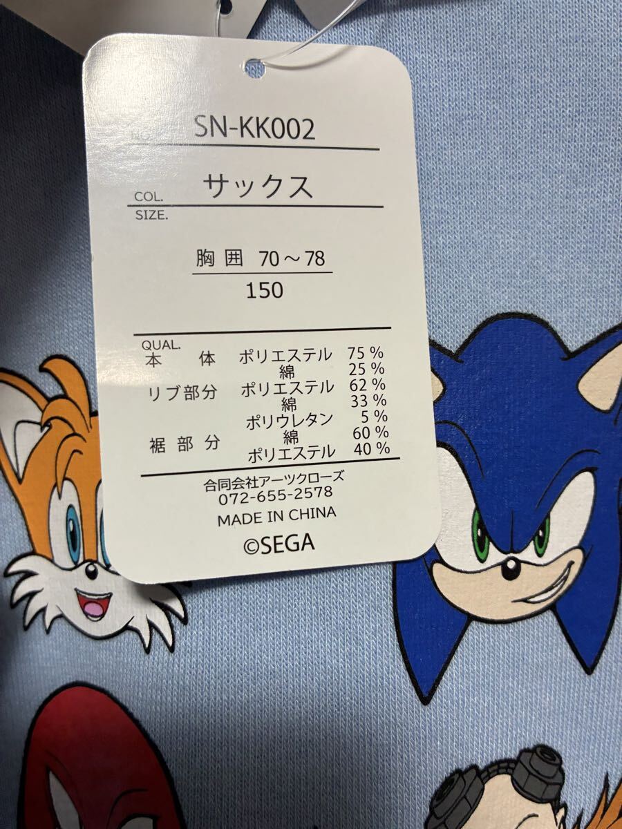 SONICのキャラクターがデザインされた青いトレーナー、サイズ150、ポリエステル75%使用。