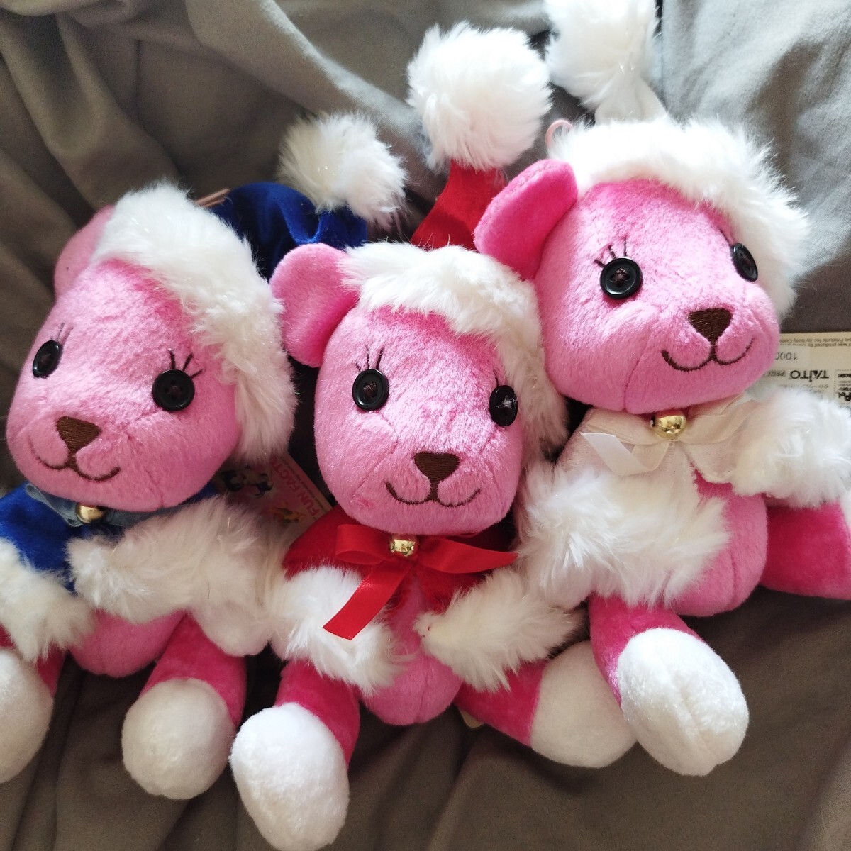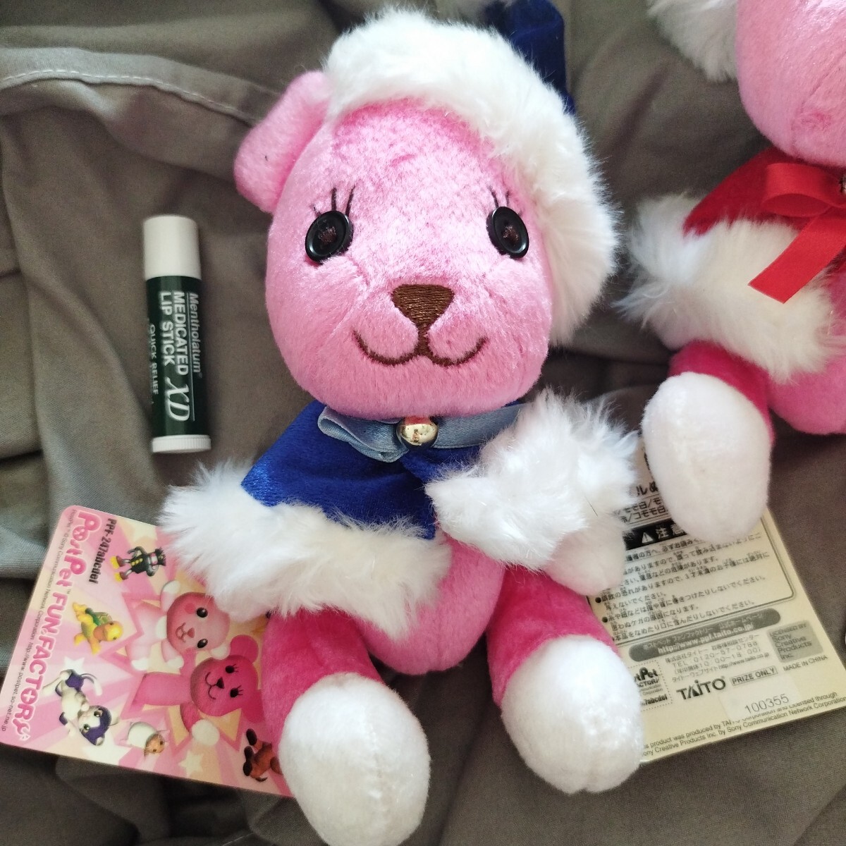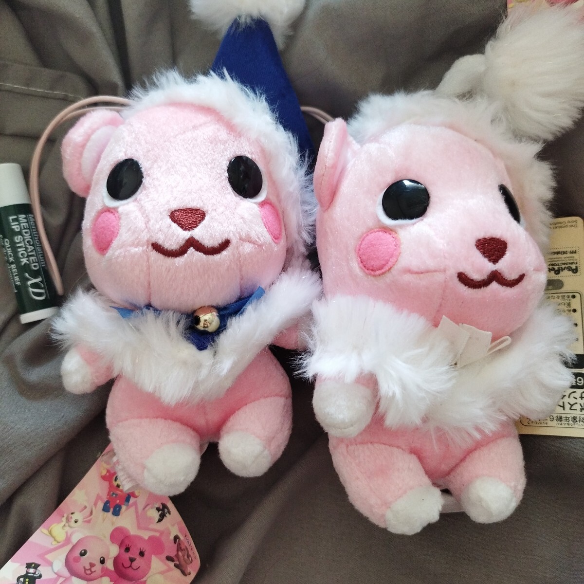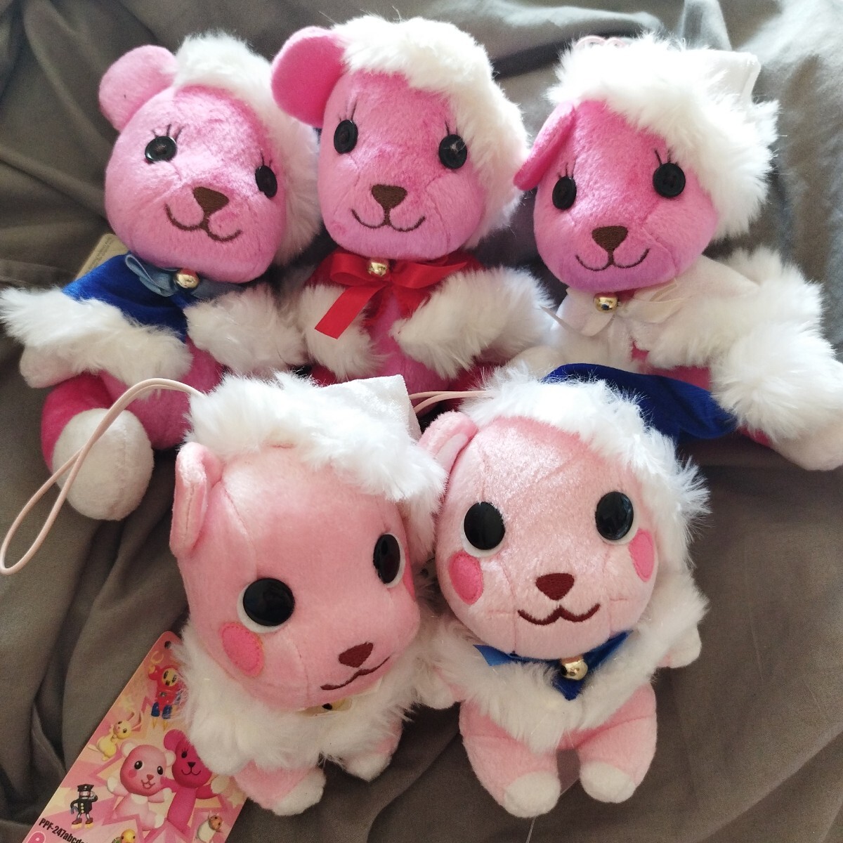 ずいぶん昔にゲーセンで取ったと思います。取ってすぐそのまま袋に入れて押入等に保管。まとめてたくさん入れていたので紙タグが経年によりヤケていたり折れてたりします。人形本体は問題ないかと思います。全6種中5種。ゴムストラップ付。クリスマスツリーに飾っても可愛いかと思います。一緒に写ってるリップは大きさの比較用です。