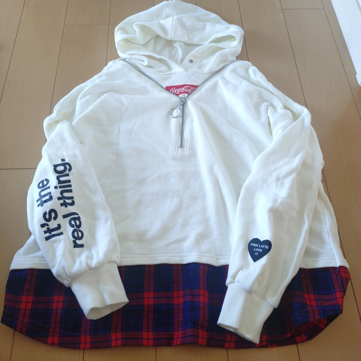 ピンクラテ150cmのプルオーバーパーカーです。コカ・コーラコラボです。重ね着風が可愛いです。10回くらい着用していたと思います。目立つ汚れ等なくまだまだ着られます。袖口中に毛羽立ちあります。子供が着用していたため細かな点気になる方はご遠慮ください。