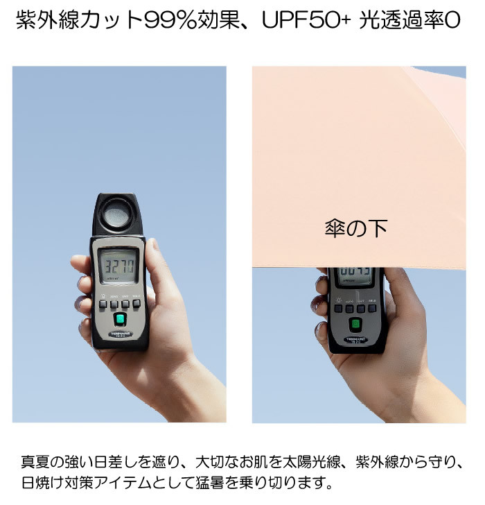 商品説明 | ★1.【UVカット*完全遮光】 強い日差しをシャットダウン 厳しい日差しに負けない生地で 肌や目へのダメージとなる太陽光・紫外線を99%以上遮ります! 最高水準のUPF50+だから安心◎ ★2.【乱反射防止の黒い裏地】最新の技術の400 Tナノ傘は、 傘面の高強度と超軽量を実現しました。紫外線カット99.9%効果、 UPF50+ 光透過率0, 〓グル?コーテイングに超高密度の傘布を配合し、紫外線から肌を守る。 ★130gの超軽量、毎日の通勤などに持ち歩いても、 負担をかけずにいつでも簡単に紫外線対策ができます。 ★【コンパクト】折りたたんで22cmと、究極のサイズと重さで、 スリムなサイズで簡単にバッグに入れられます。 ★【晴雨兼用】紫外線も急な雨に対応したいけど、荷物を増やしたくないですよね。 この晴雨兼用傘があれば快適な毎日を過ごせます♪ |