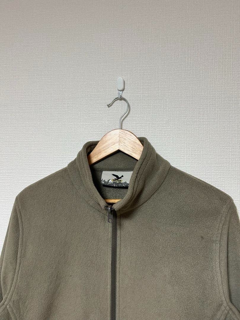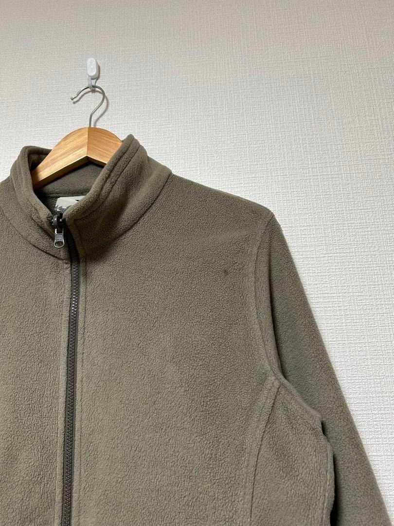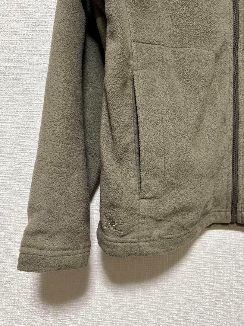 この手のフリースにしては厚手です。右腕と右裾に刺繍ロゴがあります。シンプルなデザインなのでインナーやアウターなど色々なところで重宝します。