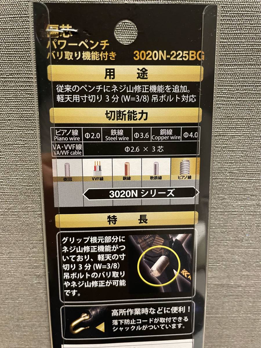 フジ矢・KUROKIN/3020N-225BG/偏芯パワーレンチ <用途> ・従来のペンチにネジ山修正機能を追加。 軽天用寸切り3分(W=3/8)吊ボルト対応 <特長> ・グリップ根元部分にネジ山修正機能がついており、軽天の寸切り3分(W=3/8)吊ボルトのバリ取りやネジ山修正が可能です。 ・高級感あふれるブラック&ゴールド仕様。 ・支点を切断部分に近づける偏芯機構を採用。テコの原理で従来品より楽に切断できます。 ・強度を保ちながら先端部を薄くする事で、1サイズ下のクラスの重量を実現。軽いので連続作業での疲労や、腰回りの重量を軽減します。 ・工具接続用シャックル付。 SIZE(mm)225 重量(g/w)340 切断能力 鉄線 mmφ3.6 切断能力 銅線 mmφ4.0 切断能力 ピアノ線 mmφ2.0 切断能力 VA・VVF線 mmφ2.6×3芯 ◆詳細はメーカーホームページをご参照ください。 ◆ノークレーム、ノーリターンでお願い致します。 ◆神経質な方の入札はご遠慮下さい ◆落札後24時間以内の取引開始、2日以内にご入金出来る方のみの入札をお願いします。