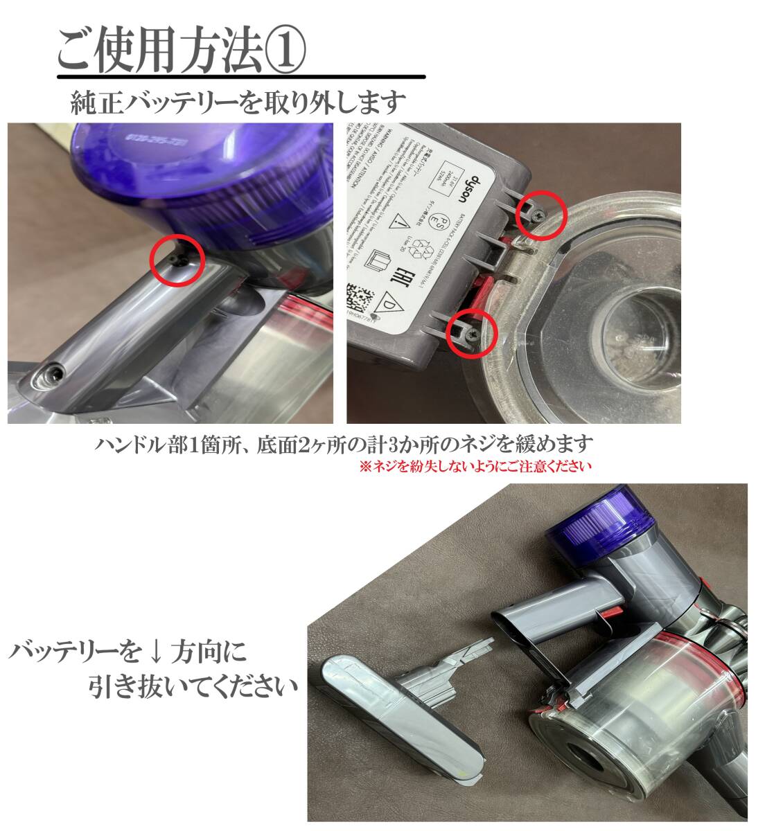 ・ダイソンの純正バッテリーは外すのに小さいネジを3箇所外す必要があります。