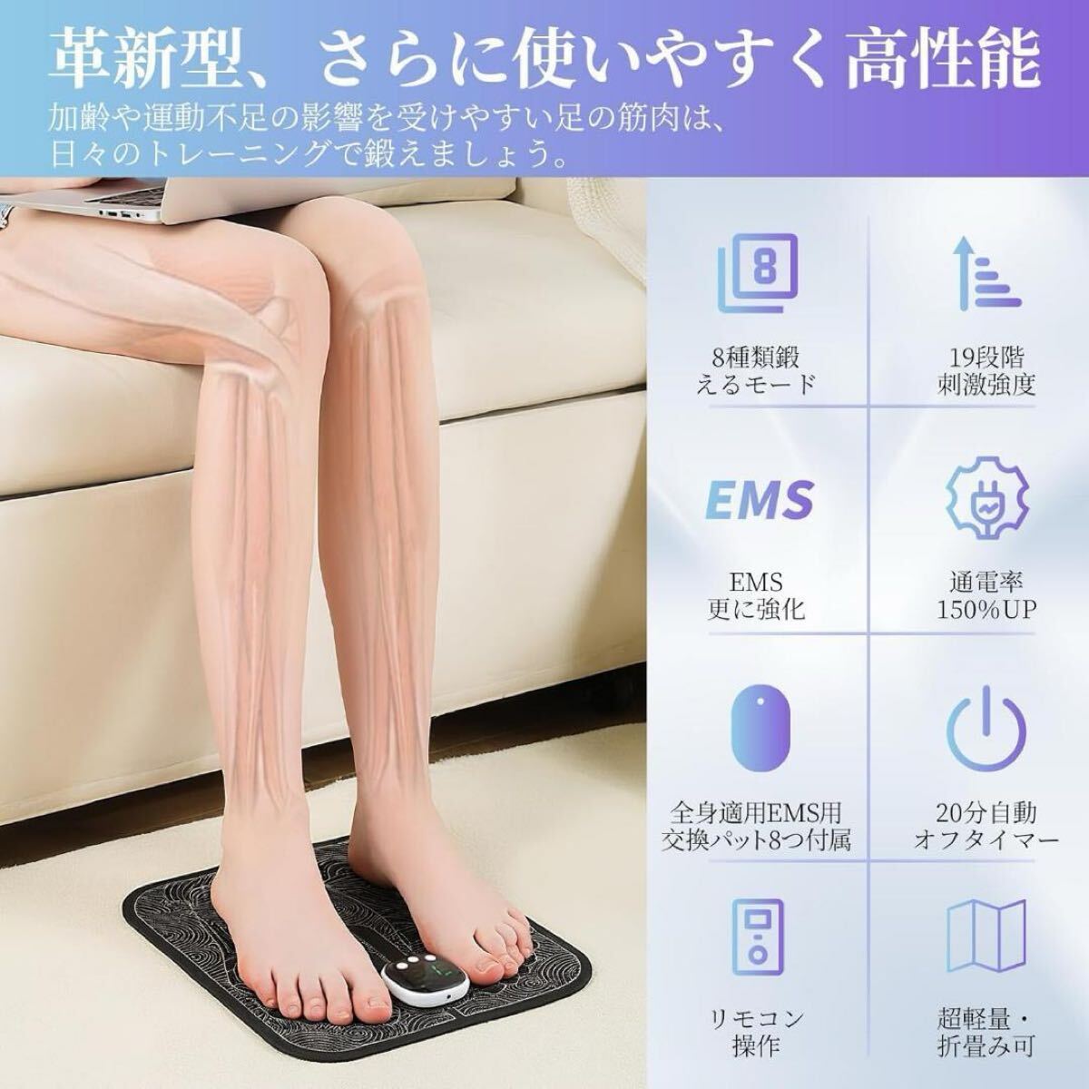 emsフットマット 足裏ケア 足リラクセーション フットトレーニング 8種類鍛えるモード 19段階強度 20分自動オフタイマー パネル&リモコン操作 Type-C充電式 コンパクト軽量設計 ジエル不要 お手入れ簡単 フットケア 男女兼用 全身用 敬老の日 誕生日プレゼント 家庭用 8つ全身用パット付