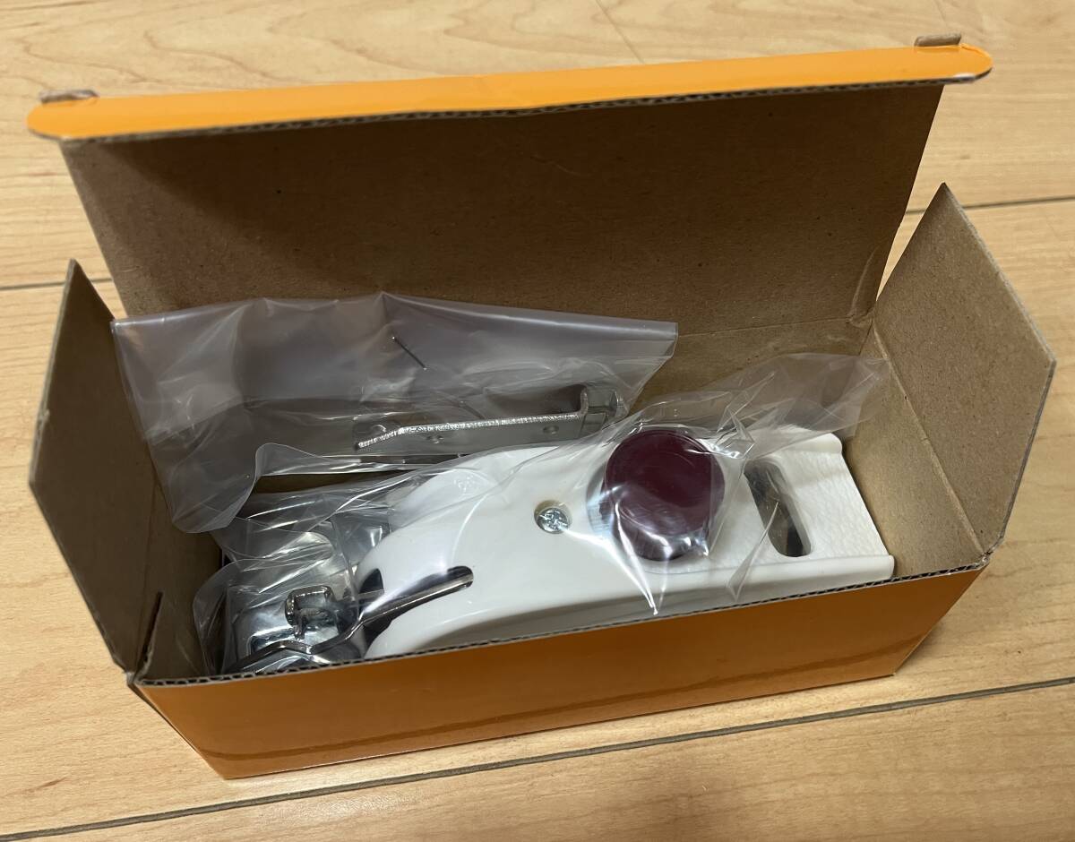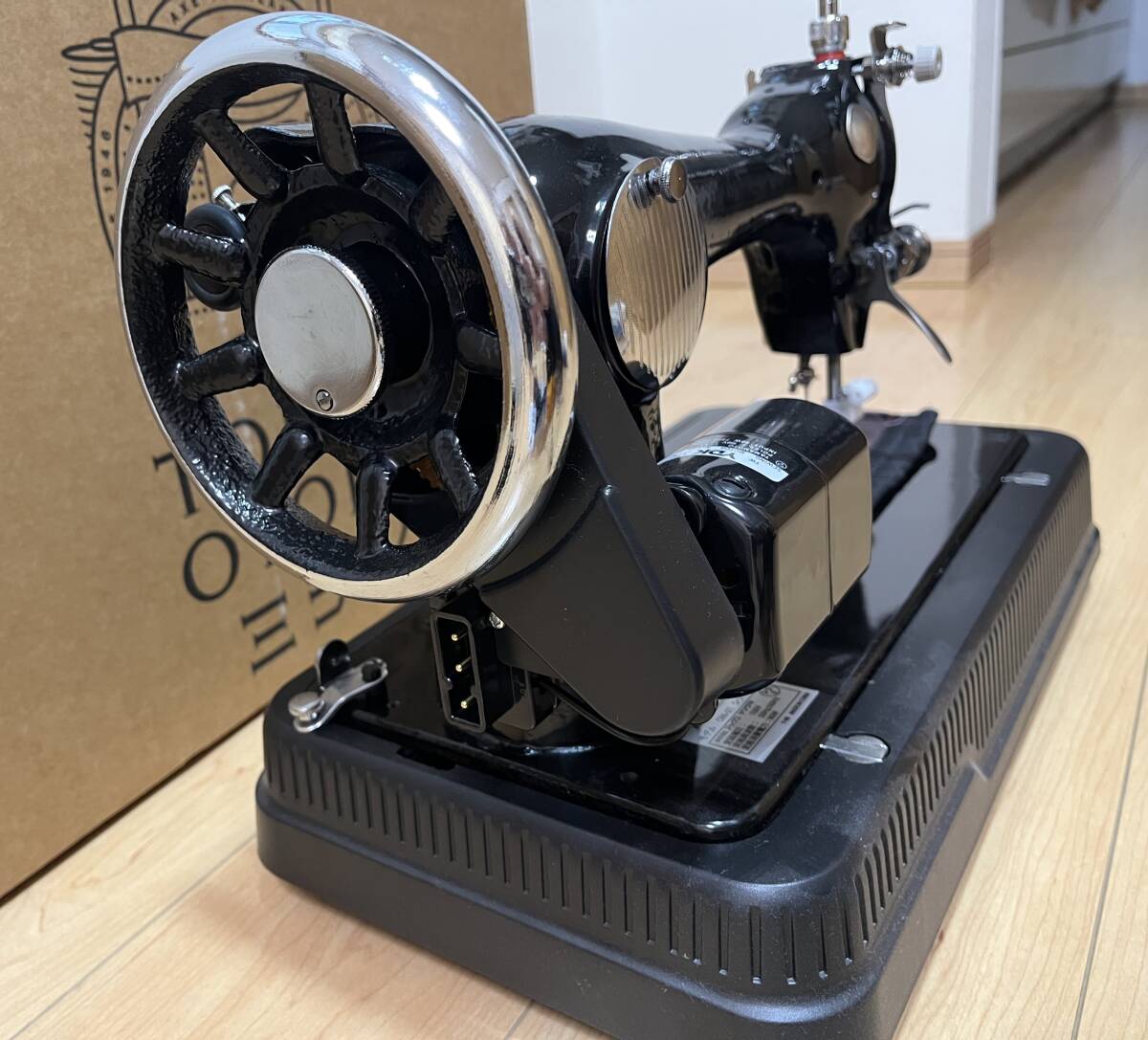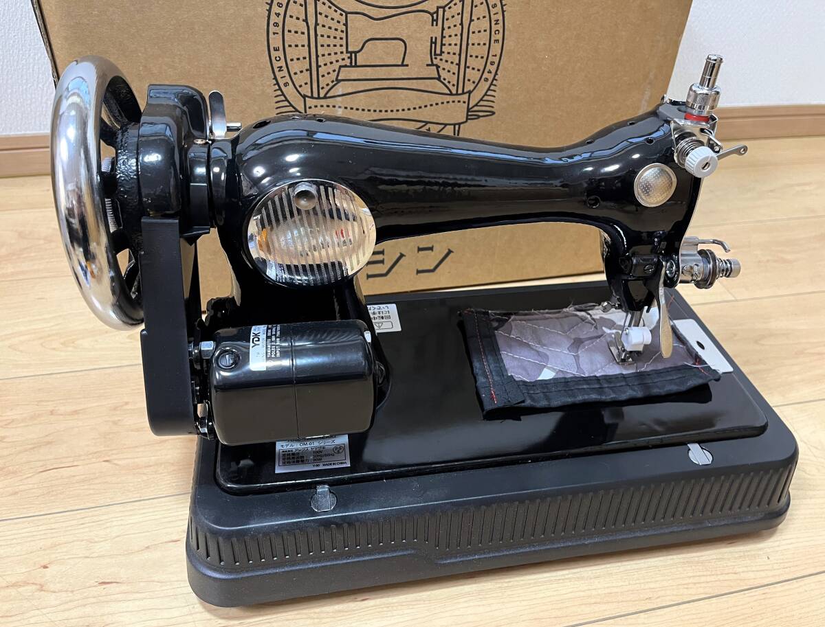 商品は写真の通り、ミシン本体、標準付属品、オプションのボタンローラー、マグネット定規です。