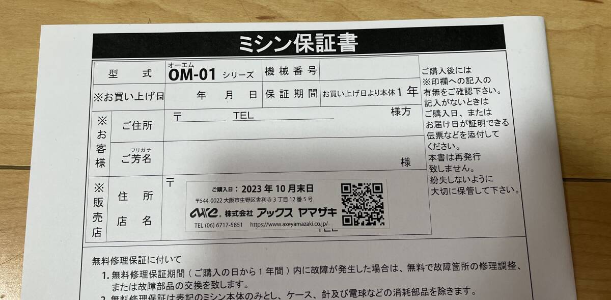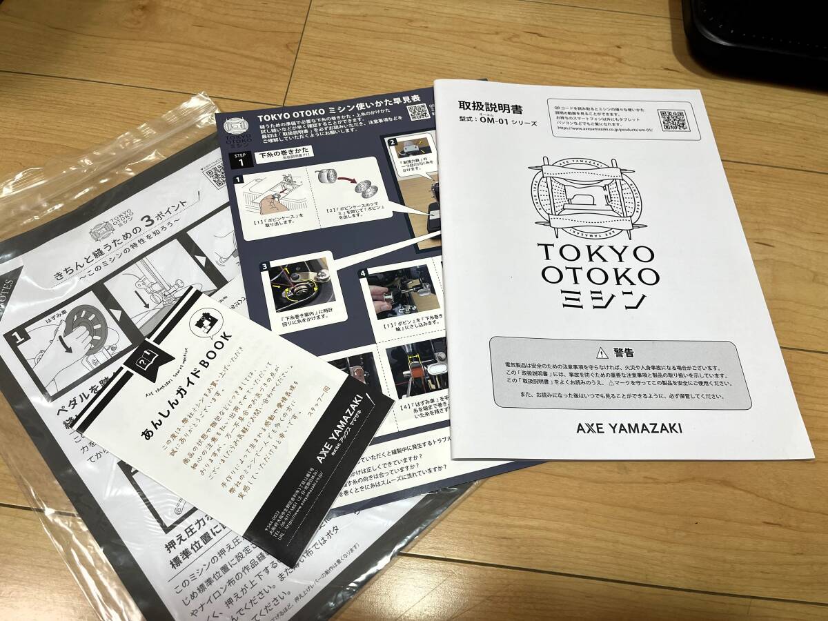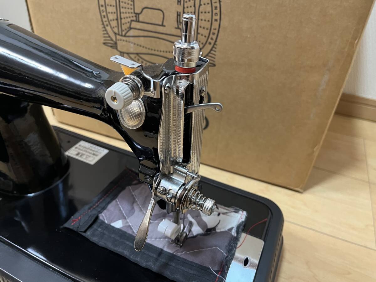 商品は写真の通り、ミシン本体、標準付属品、オプションのボタンローラー、マグネット定規です。