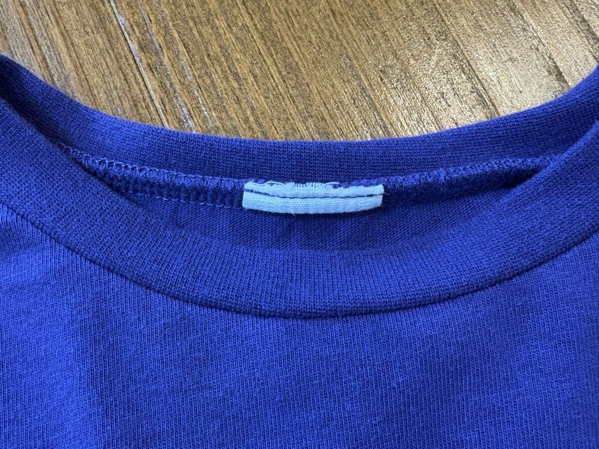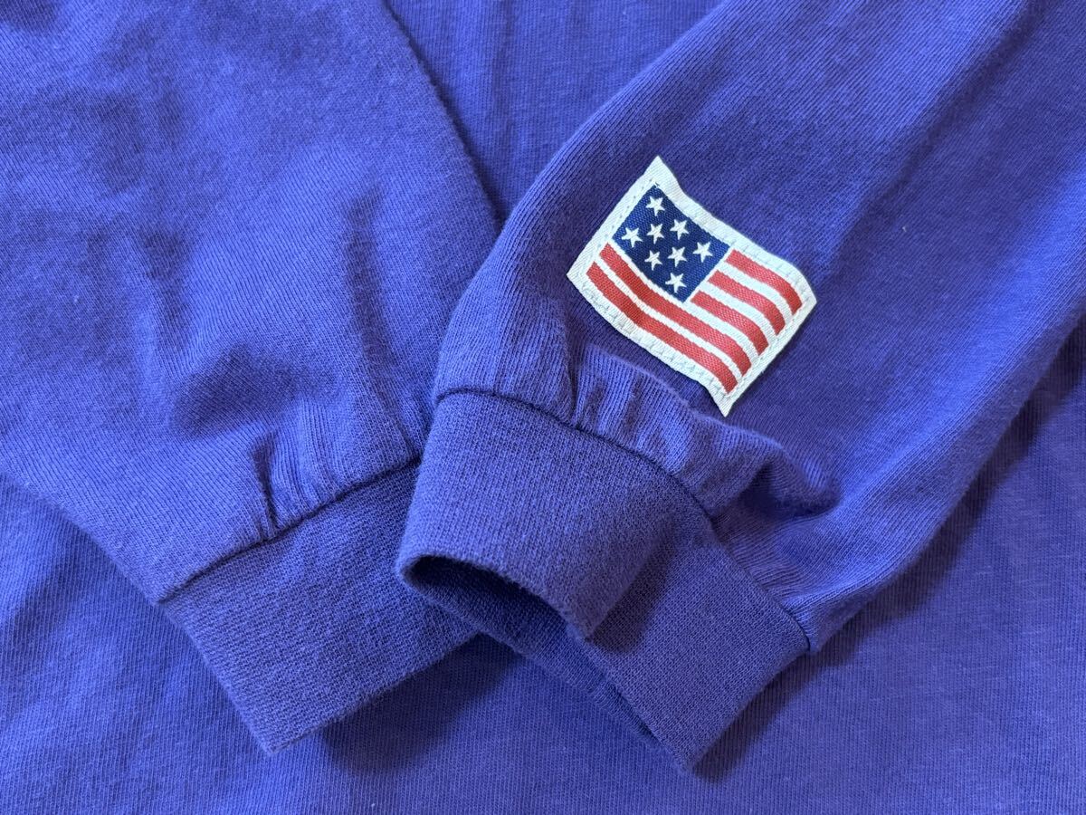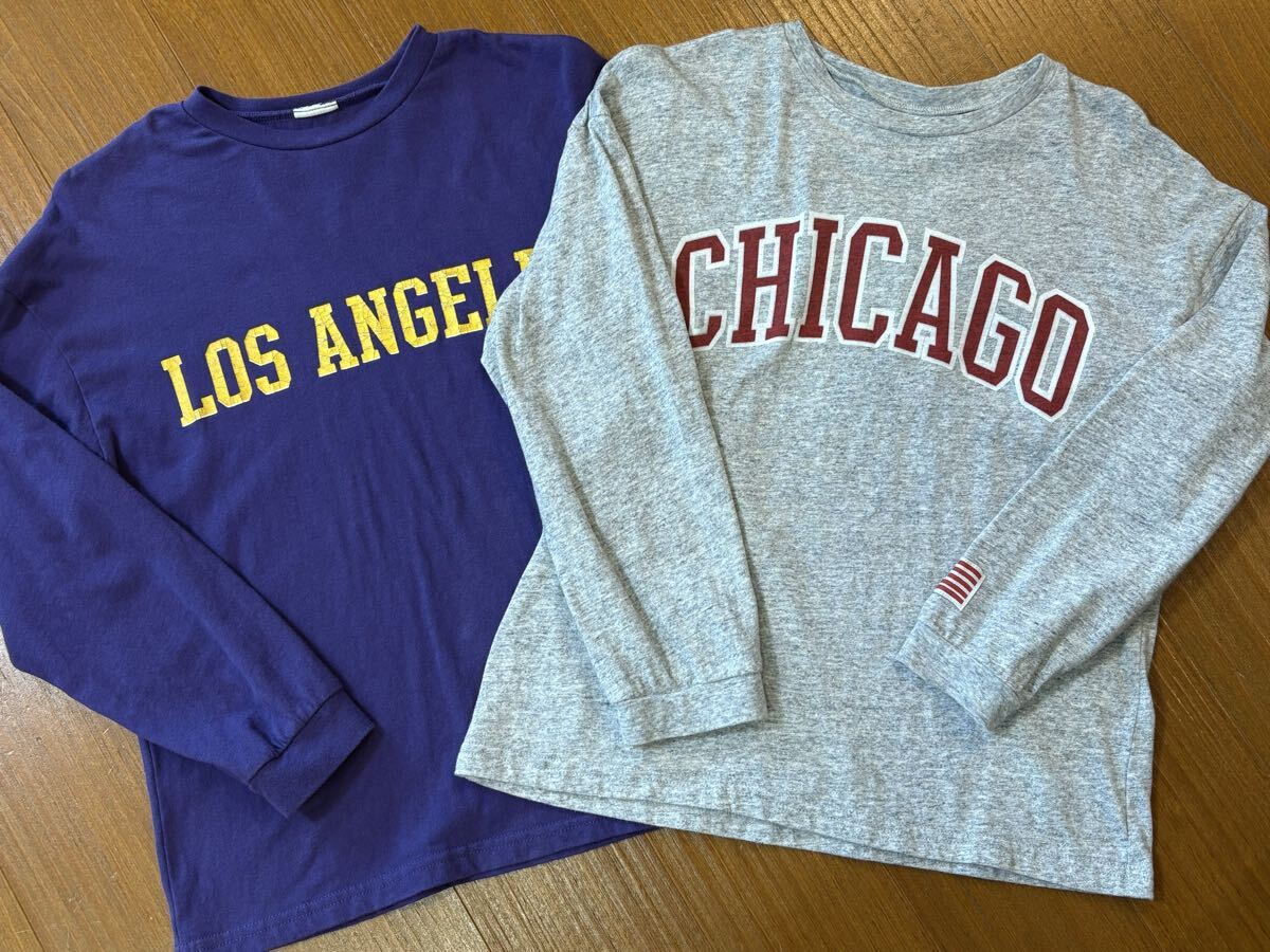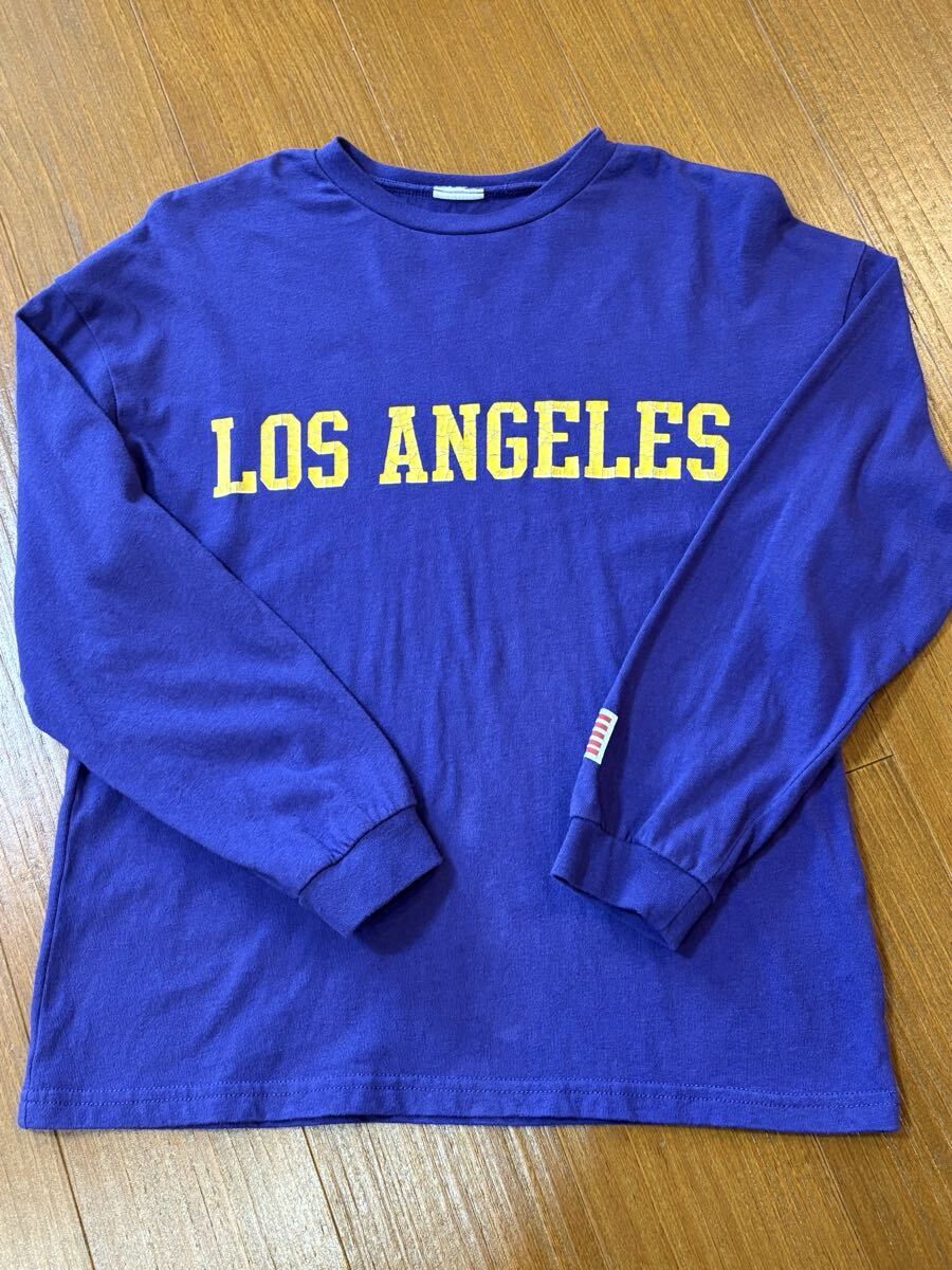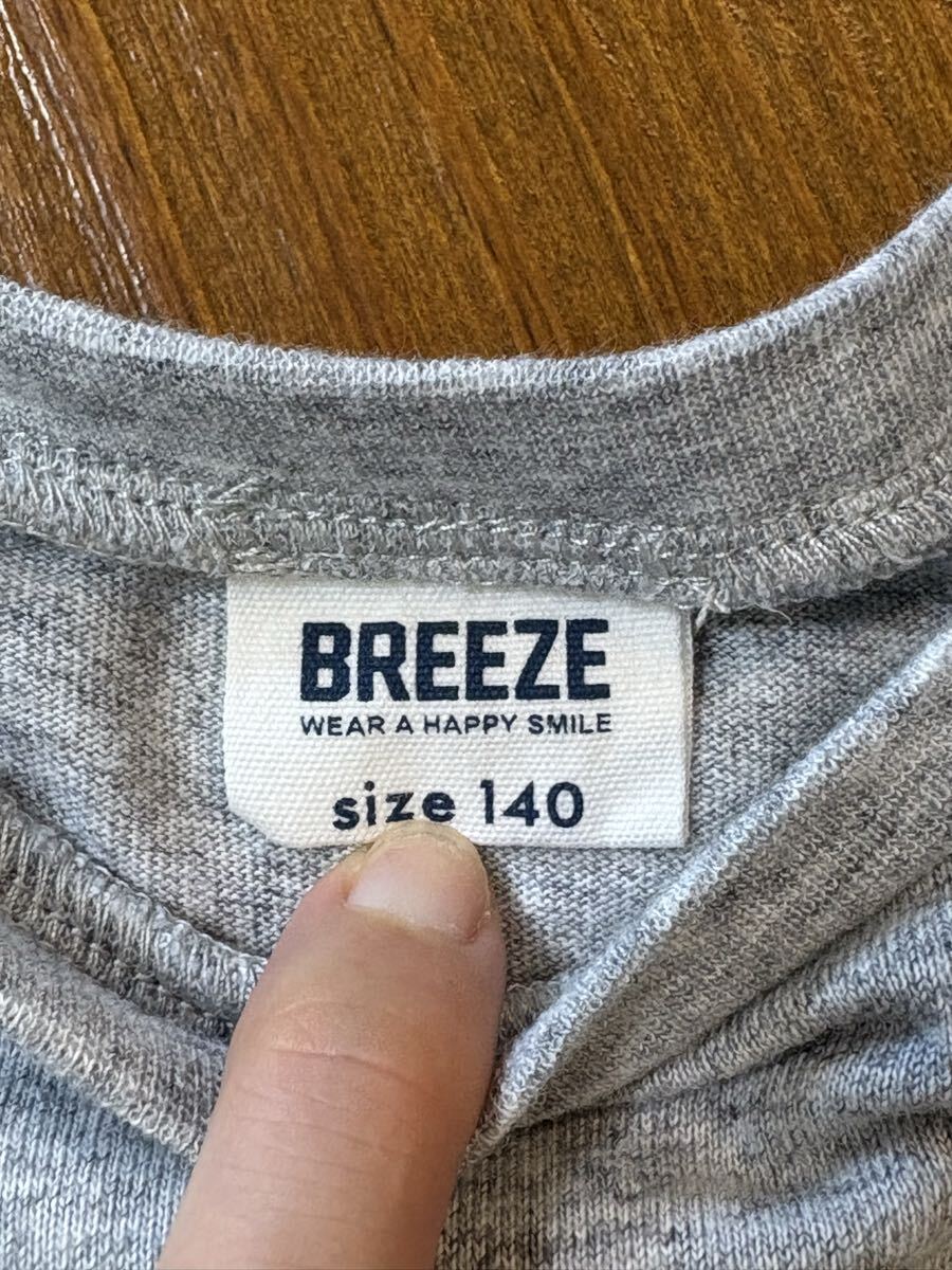 BREEZEの長袖Tシャツ2枚です。サイズは140で、お色はグレー系とパープル系です。パープルのTシャツは首元のタグを息子が切ってしまい、ございません。また、背中のロゴの下にうっすらと色落ちが3ヶ所ほどございます。7枚目の写真でご確認ください。素材は綿100%です。もともとヴィンテージ感のあるTシャツで、胸元のロゴもカッコいいです。