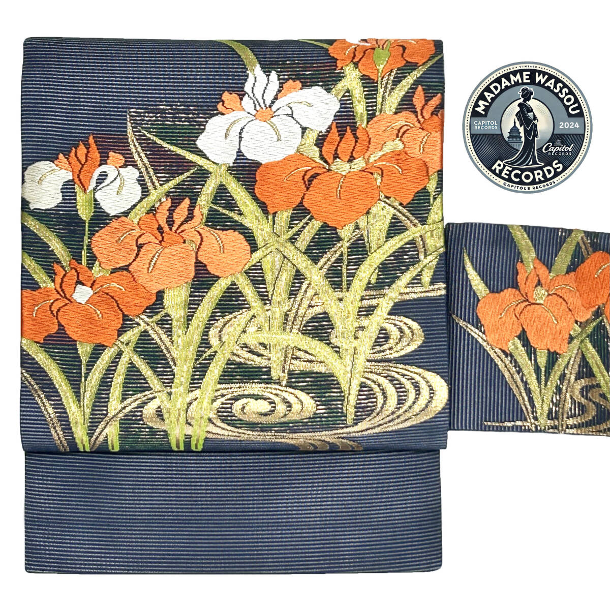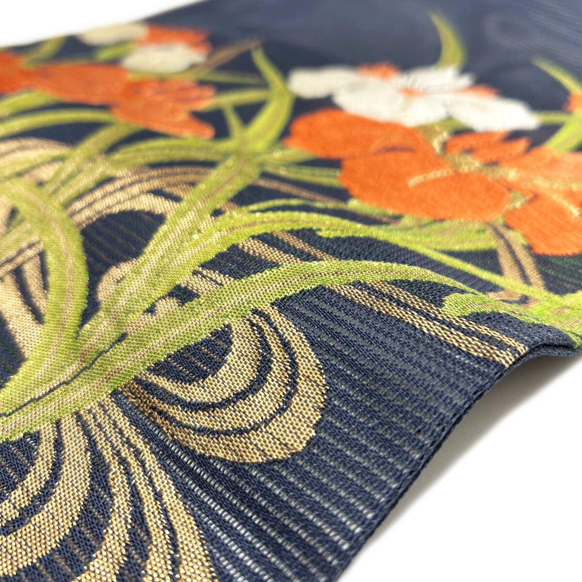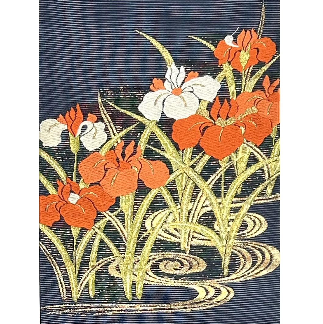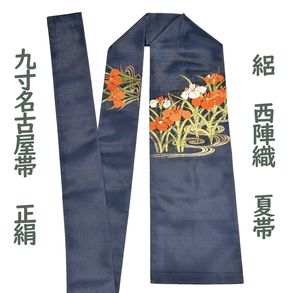 紺色の絽の地に、杜若が金糸などを用いて織り出された、風通しの良さそうな九寸名古屋帯です。