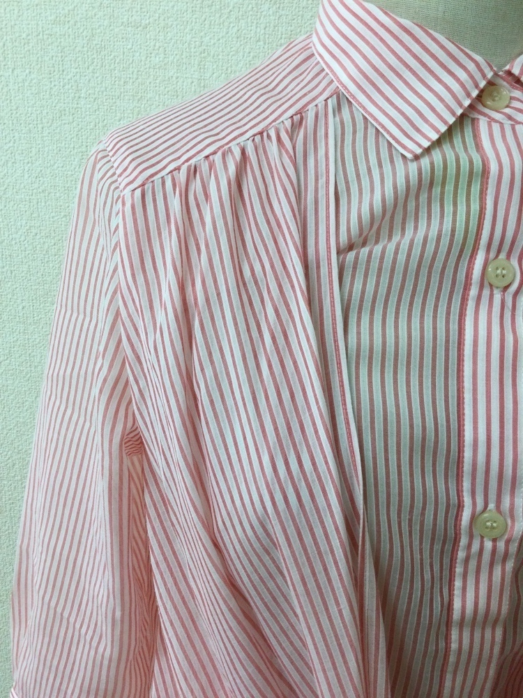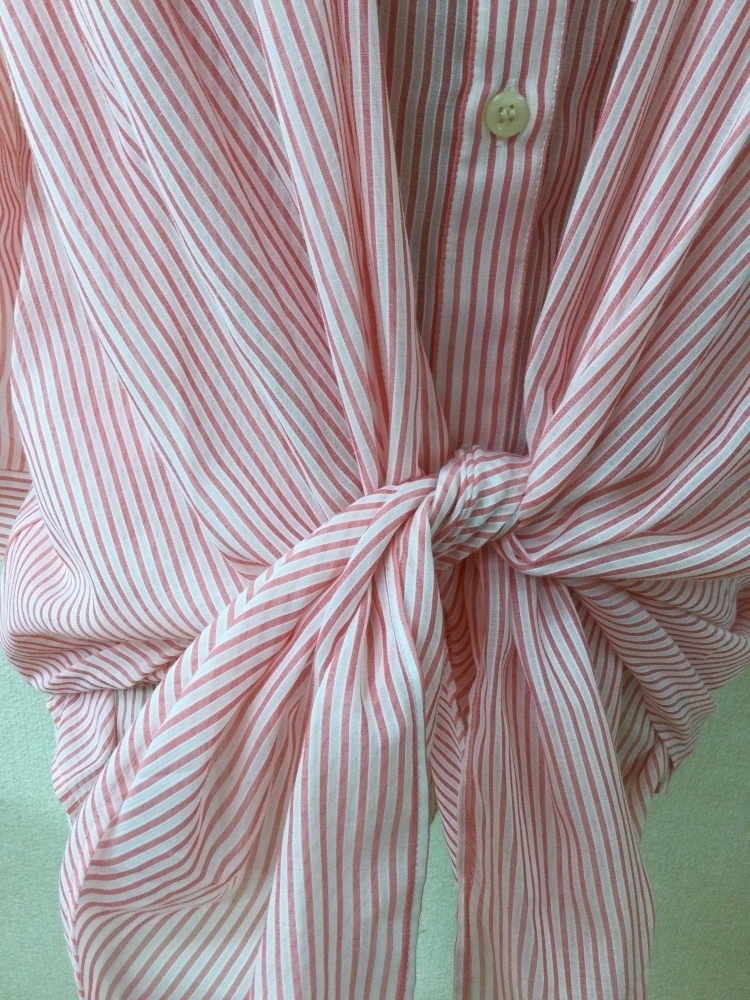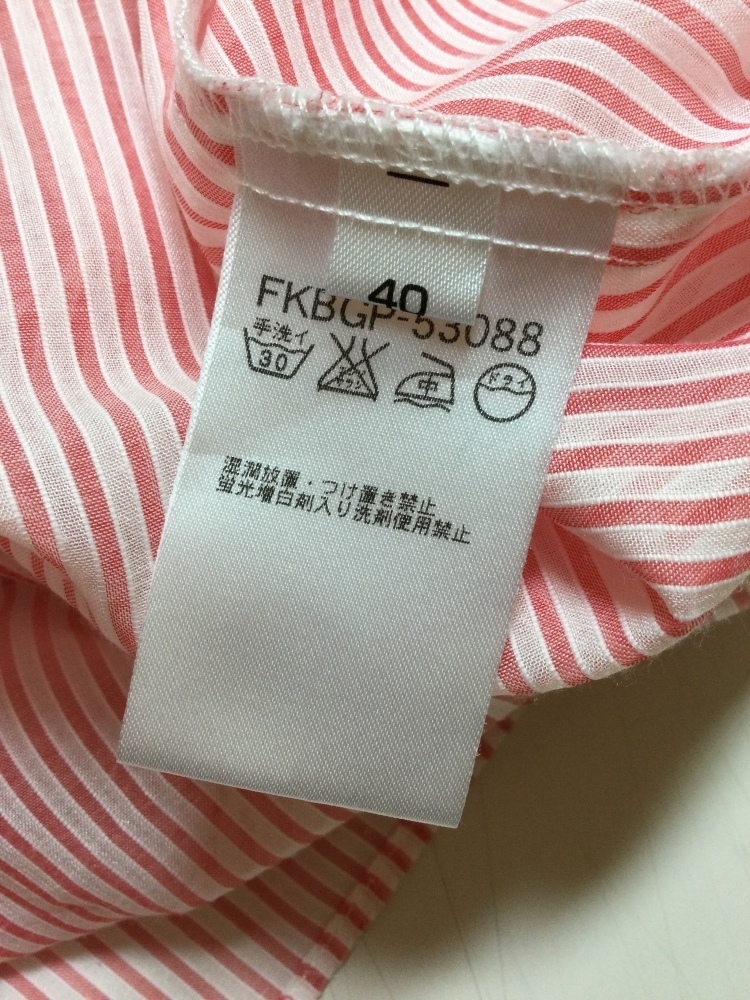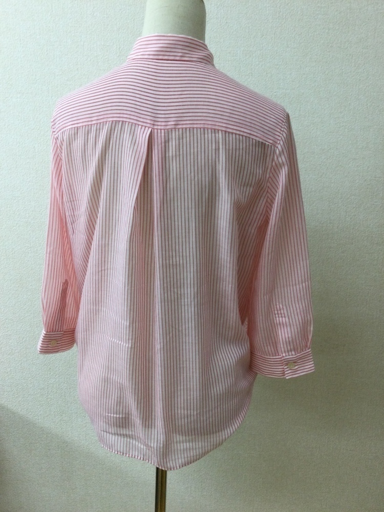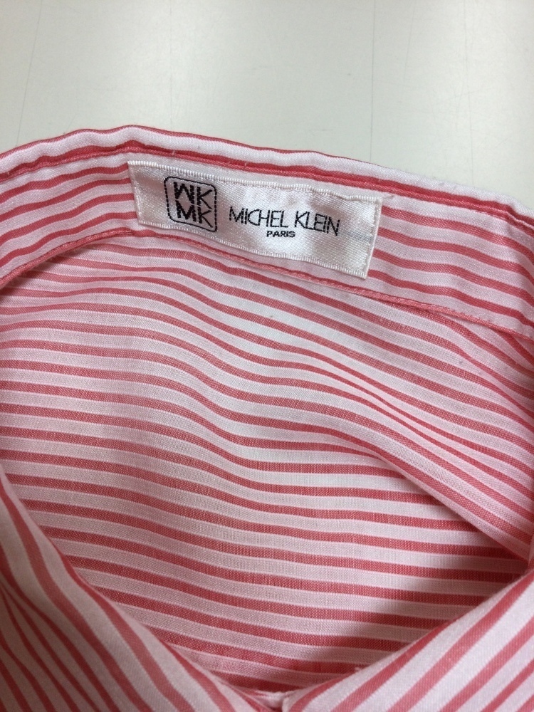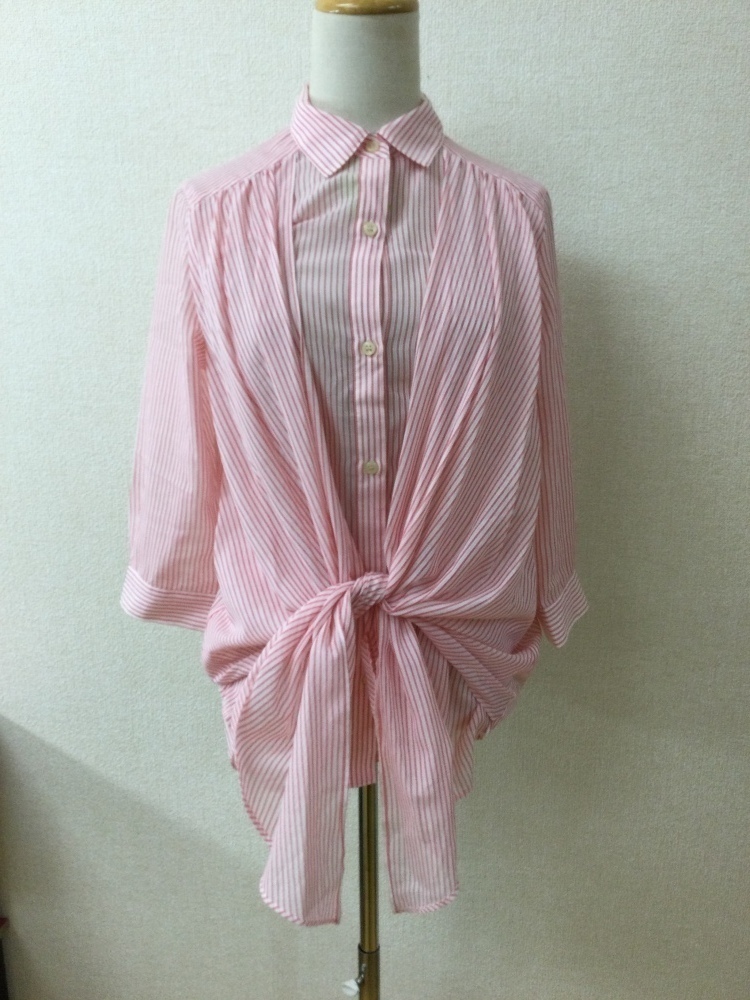 管理番号:99^131937 MK ミッシェルクラン ストライプシャツ 白と薄めの赤 裾で結べるデザイン 表示サイズ:40 実寸(参考)