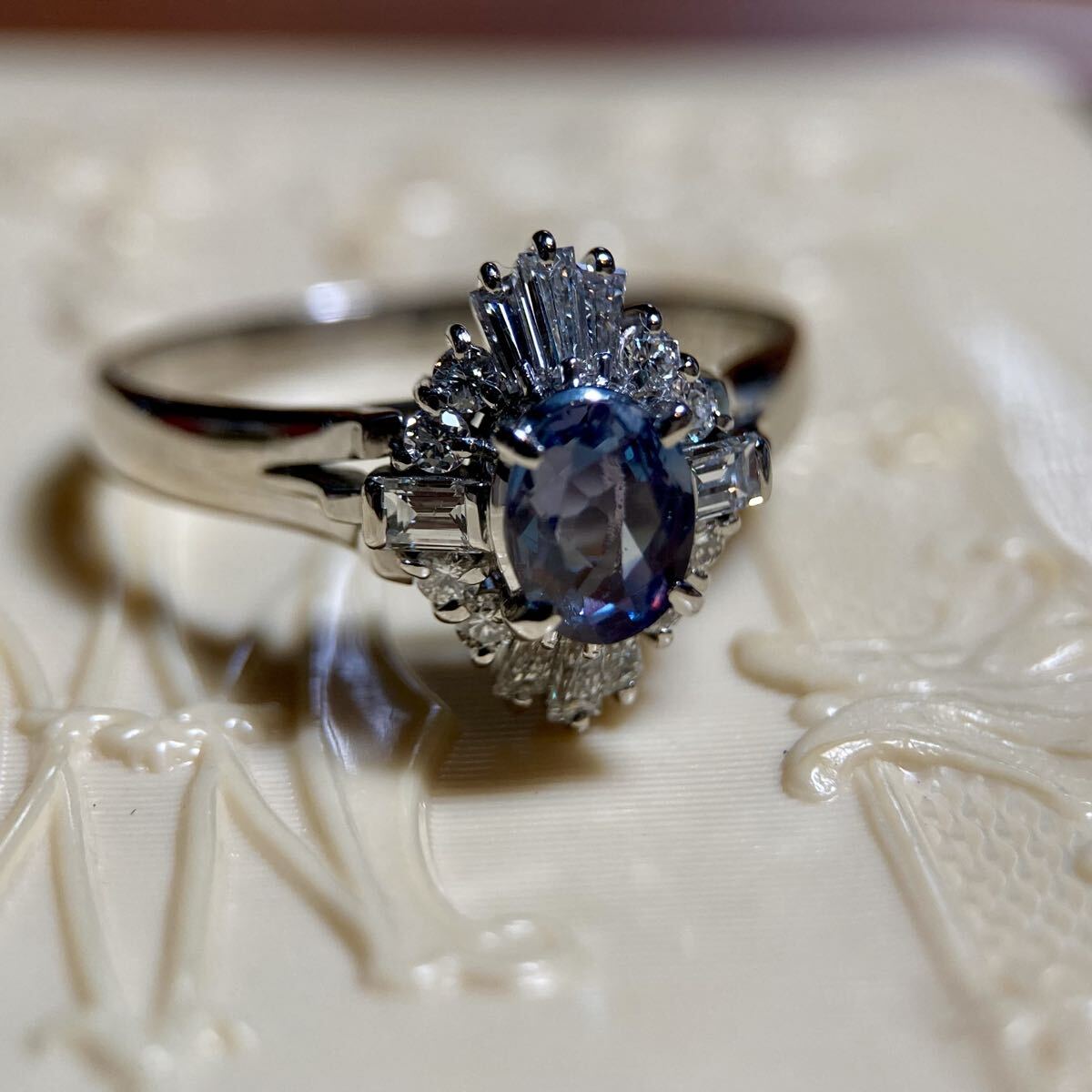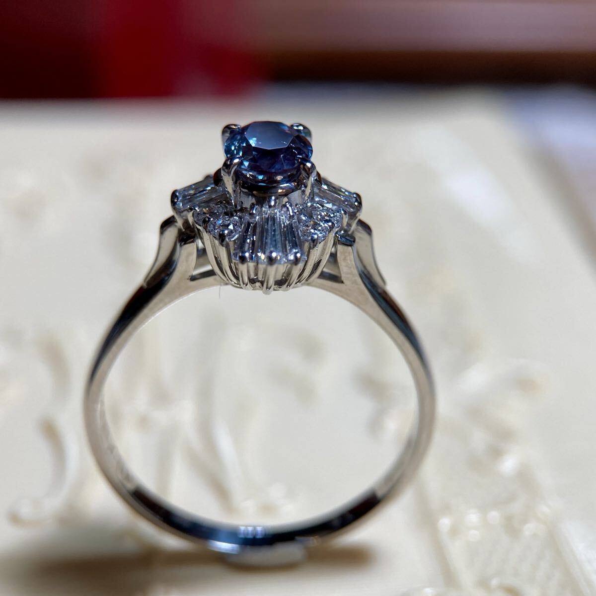 アレキサンドライトを囲むダイヤモンドは、テーパーカット、ラウンドカット、バゲットカットの3種類が巧みに配置され、細部までこだわりぬかれば仕立てにより、多彩な煌めきが織りなす立体感と、気品あるバランスが、指元に上品で華やかな存在感を添えます。