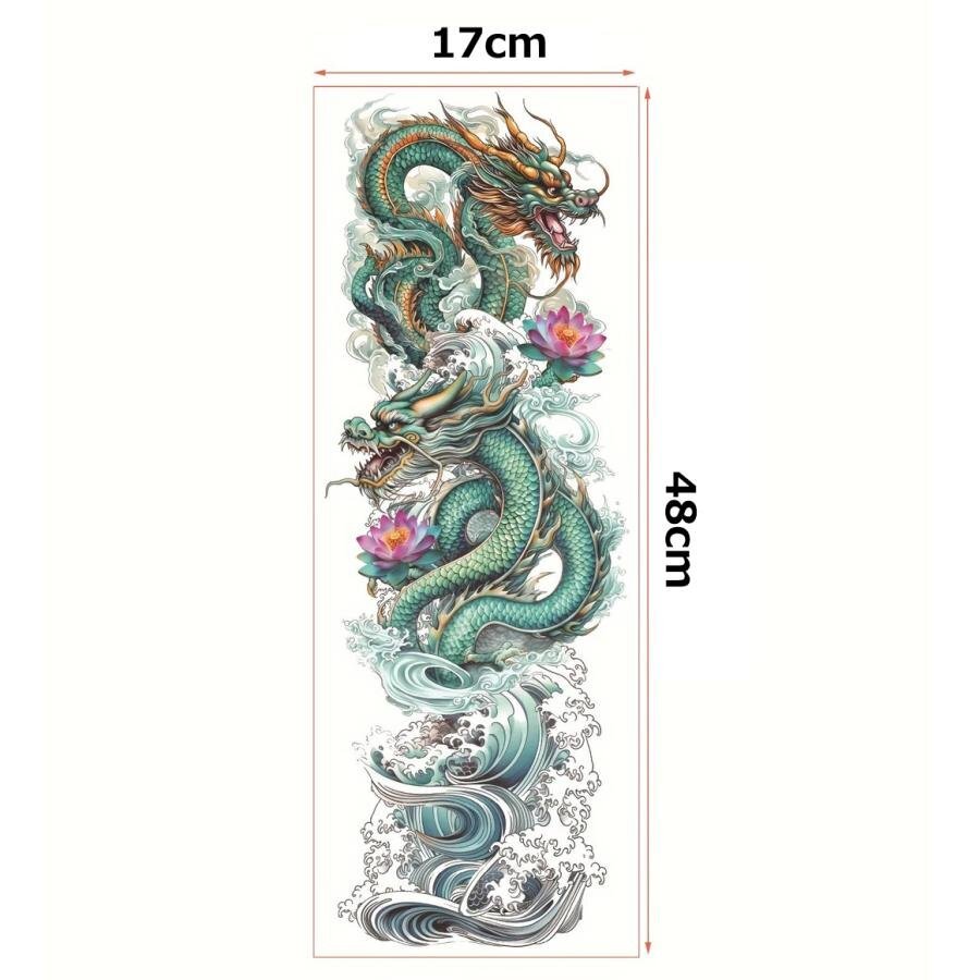台紙サイズ 約 17cm×48cm 手首から肩までサイズのタトゥーシールです。 ※敏感肌、目の近く、または接着剤にアレルギーがある場合は使用しないでください。 【使用方法】 ●透明フィルムを剥がし、スプレーまたは濡れタオルでステッカーをしっかりと濡らして下さい。 ●10秒間、肌に密着させ、ステッカーを剥がします。その後約2時間濡らさないで下さい。 ●約、6時間後に発色開始→約24~48時間程度で完全発色します。 ●約1~2週間持続します。 【貼る時のコツ】 シートそのままの大きさだと曲げ辛く密着しにくい為、余白部分を切ってから貼るのがコツです。 ※商品画像の色味は画面でみた場合と実際は多少の色差が生じる場合がございます。 ※海外製品のため入荷時点でしわや折れ目が付いている場合がございますが、ご使用には問題ございませんので予めご了承ください。