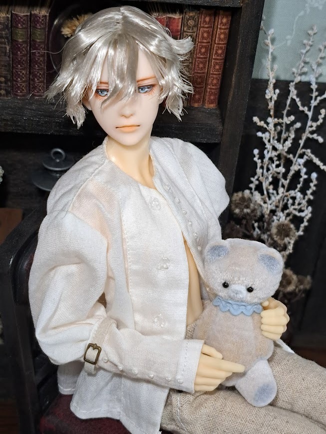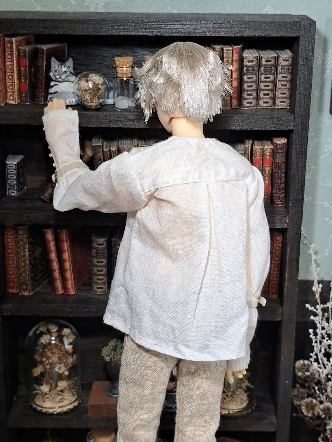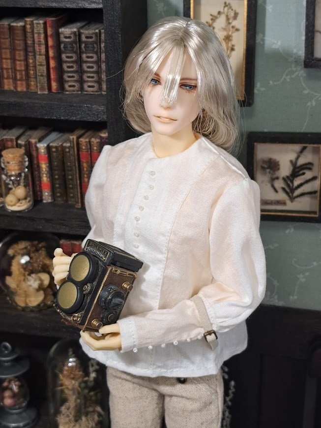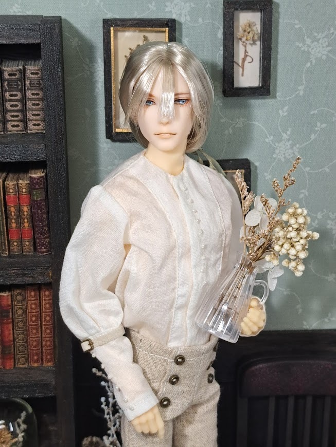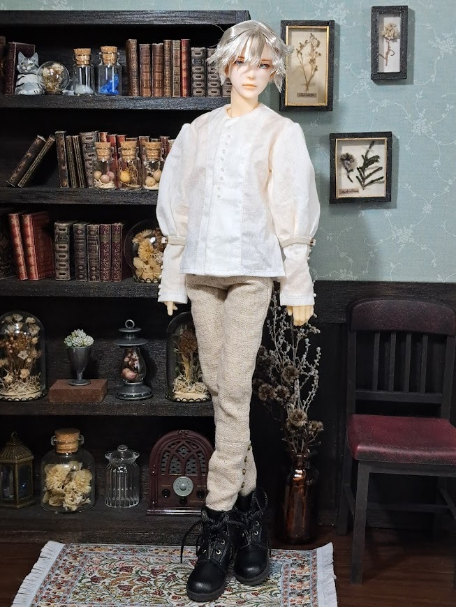 シャツ:生成りの透け感があるコットン、前スナップ留。着用の際は手首パーツを外してください。
