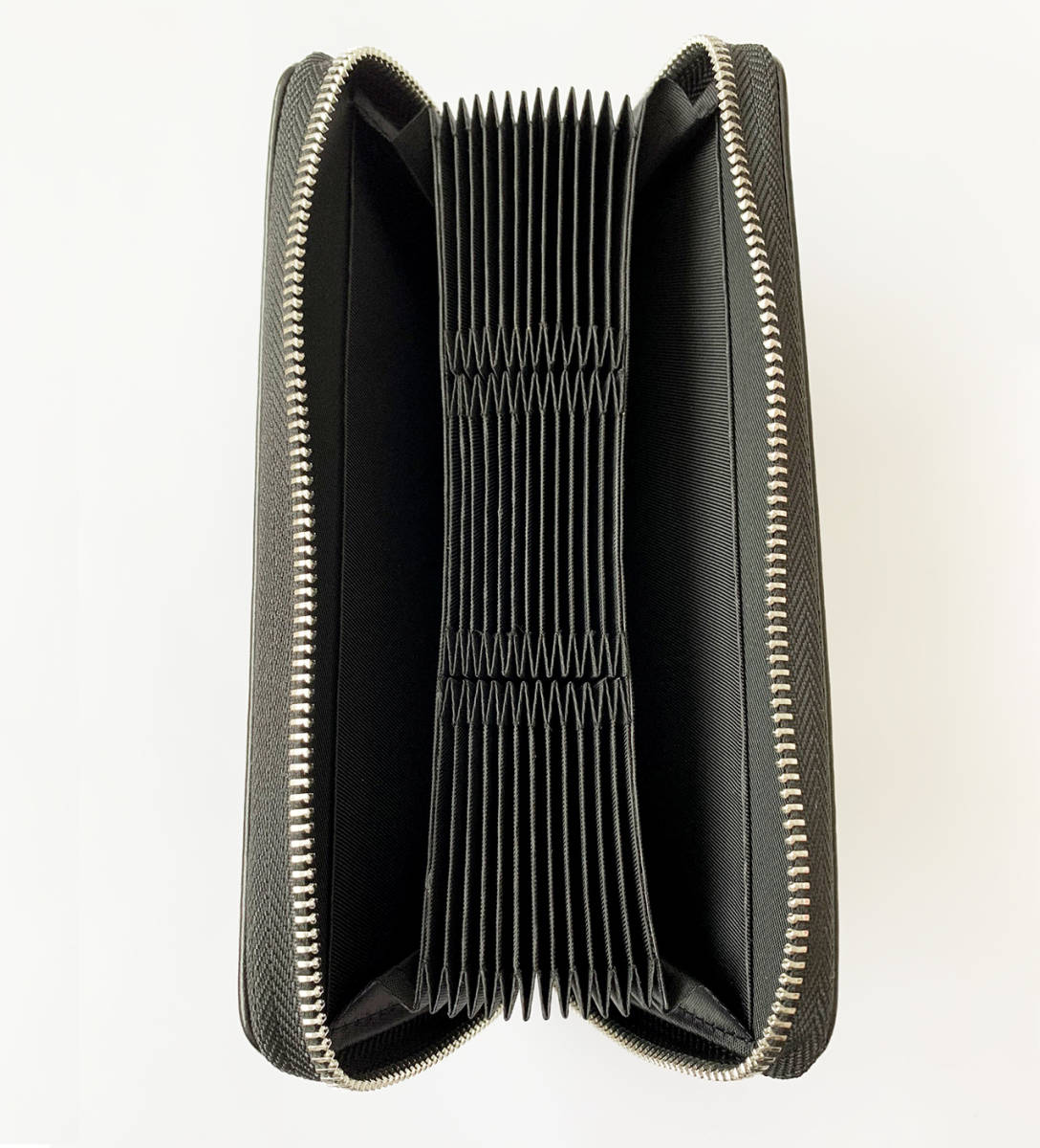 持ちやすい大きめのラウンドジップ ファスナー で、ガバッと大きく開くじゃばら式 なので、必要なカードを取り出しやすく使いやすい財布です。
