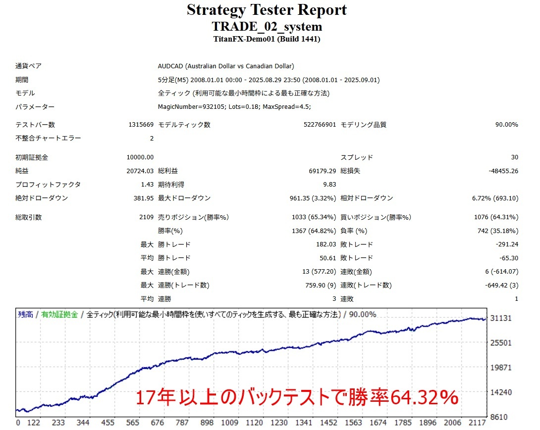バックテストは0.18 Lots(1万通貨)で行っています