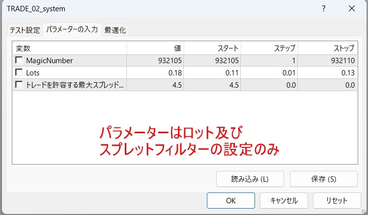 ※基本的にはロット及びスプレッドフィルターのみ調整して頂くカンタン設定です。