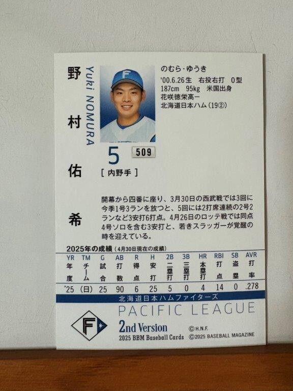 【2025 BBM 2nd】509野村佑希(北海道日本ハムファイターズ)レギュラーカード※キラカード版