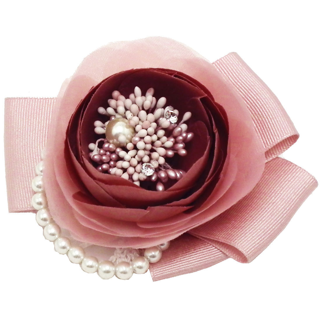カップ咲きのオールドローズのような丸い花びらが可愛らしいコサージュです。 |