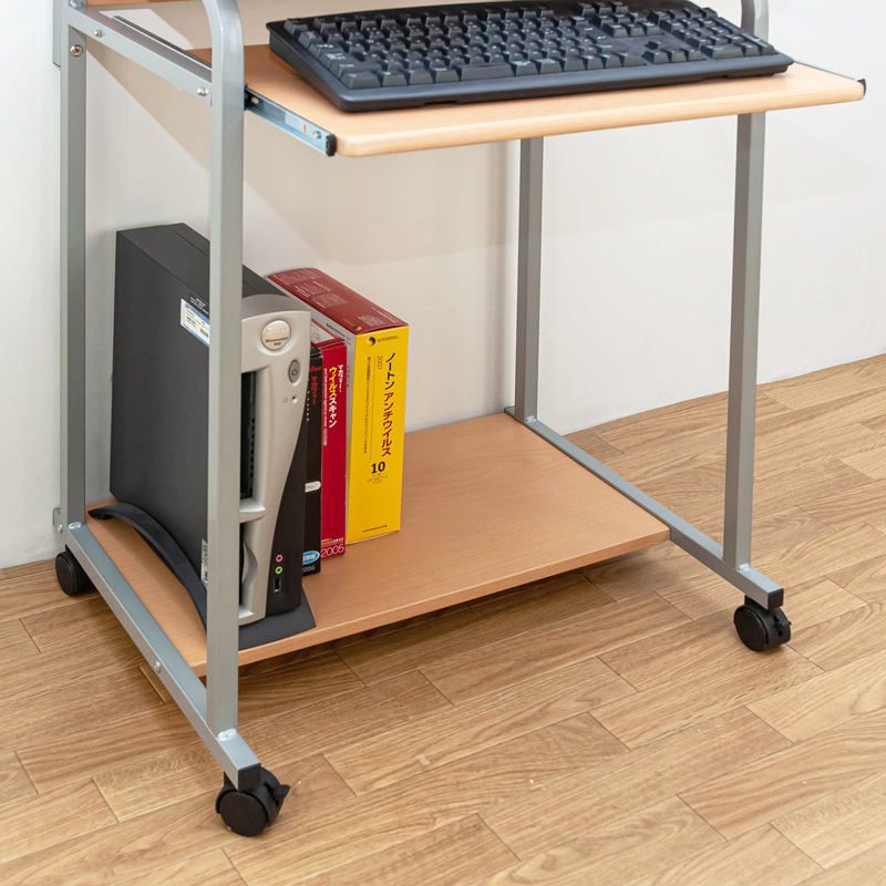 | 商品説明 | 組立品(約20分) 幅60cmで場所を取らない省スペース向けのPCデスク! 三種類の棚を活用してデスク回りの小物類を綺麗に整理できます! スリムなのに十分な収納スペースを備えた棚付PCデスク。 天板下にはスライド棚があり、場所をとりがちなキーボードも簡単に収納できます。 上下段はプリンターやファイルなど手元に置きたいものの整理に便利! キャスター付きなので移動もスムーズ!その場で固定ができるストッパーも付属します。 |