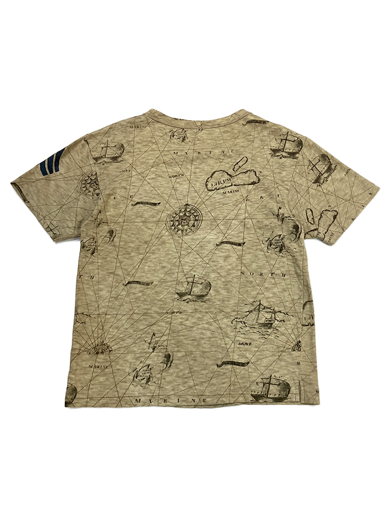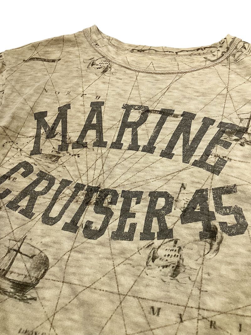 ヴィンテージの様な織りムラのある生地で作られたTシャツに古い海図の様な地図が全体的にプリントされており