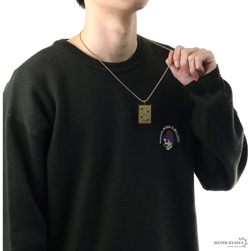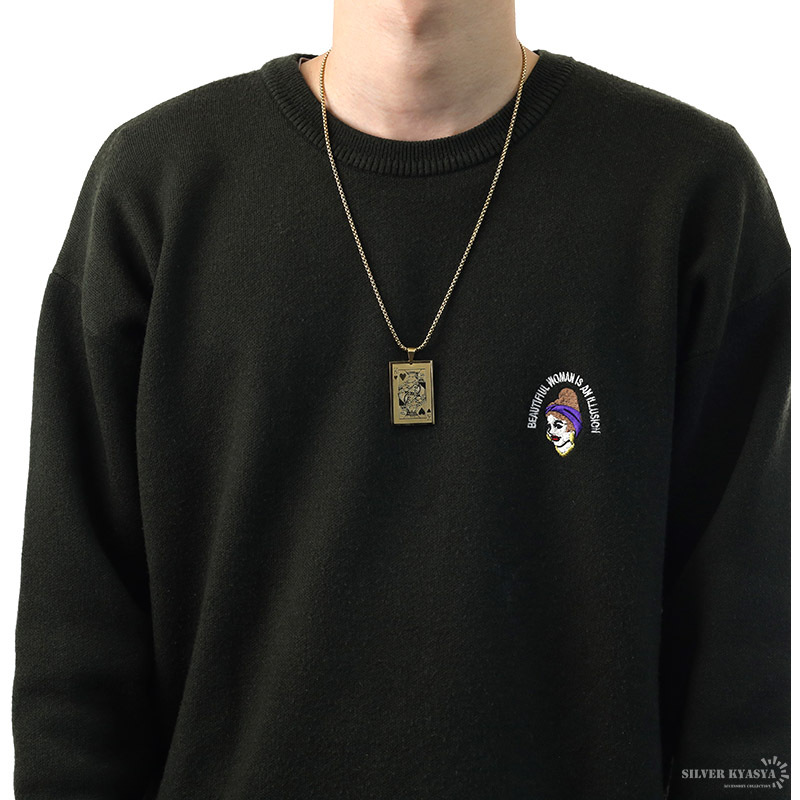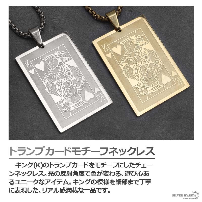 キング(K)のトランプカードをモチーフにしたチェーンネックレス。光の反射角度で色が変わる、遊び心あるユニークなアイテム。キングの模様を細部まで丁寧に表現した、リアル感満載な一品です。