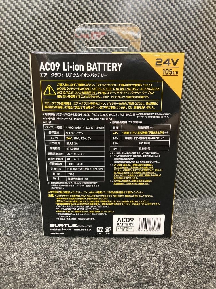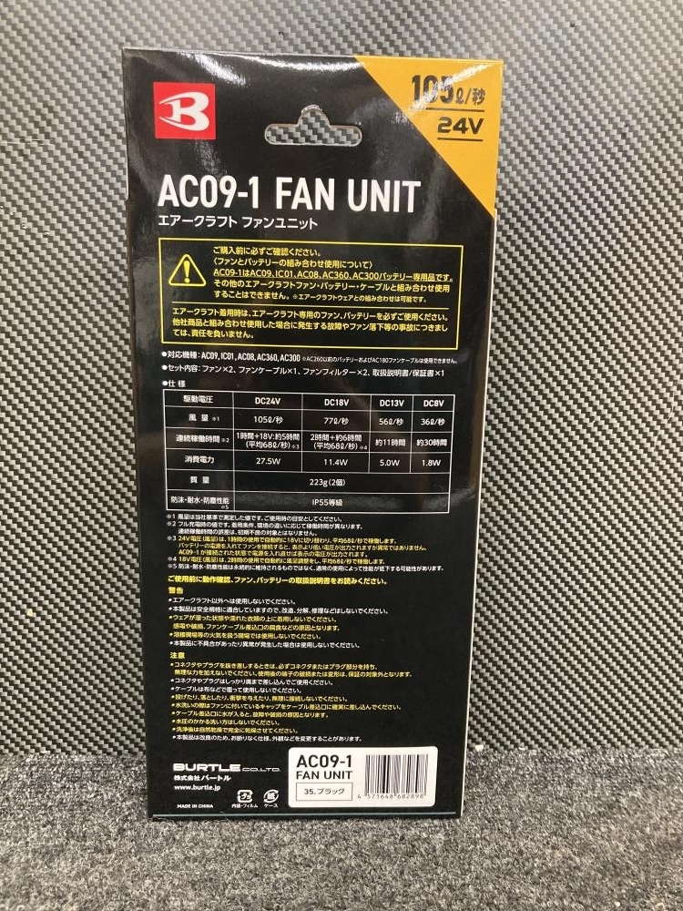 バートル BURTLE ■商品名 空調服用ファン+バッテリー ■型番 AC09+AC09-1 |