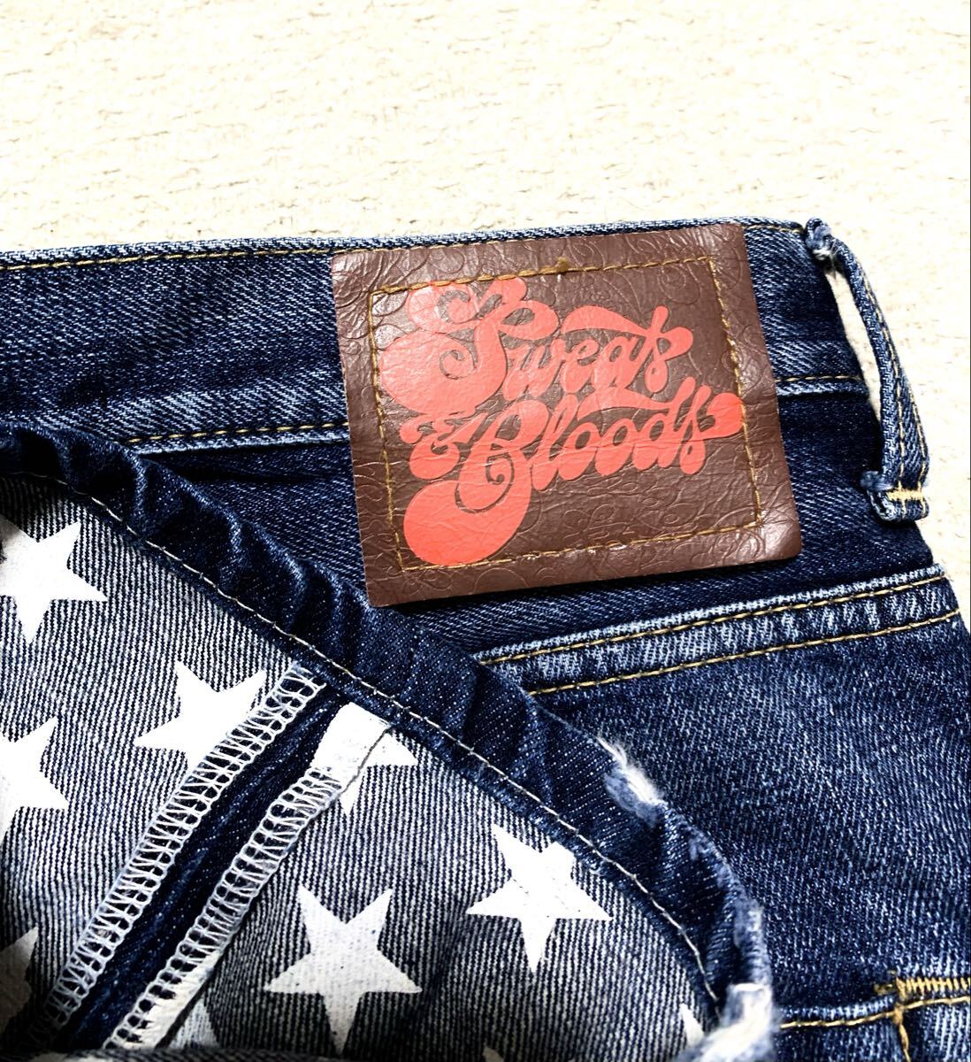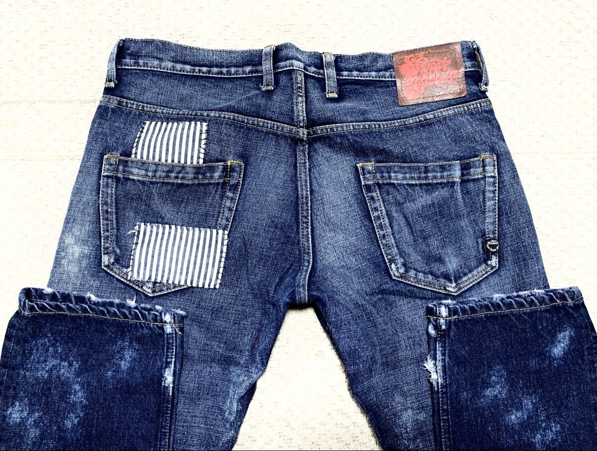 その他に左前太もも付け根と右膝にワッペン、右前太もも付け根にペイント、左ヒップポケットにヒッコリー生地の充てが施されています。