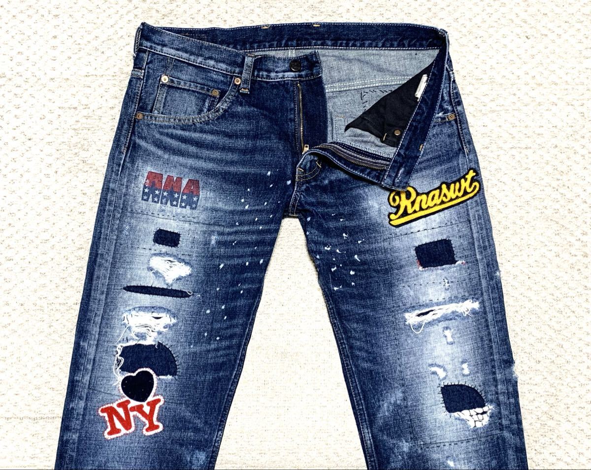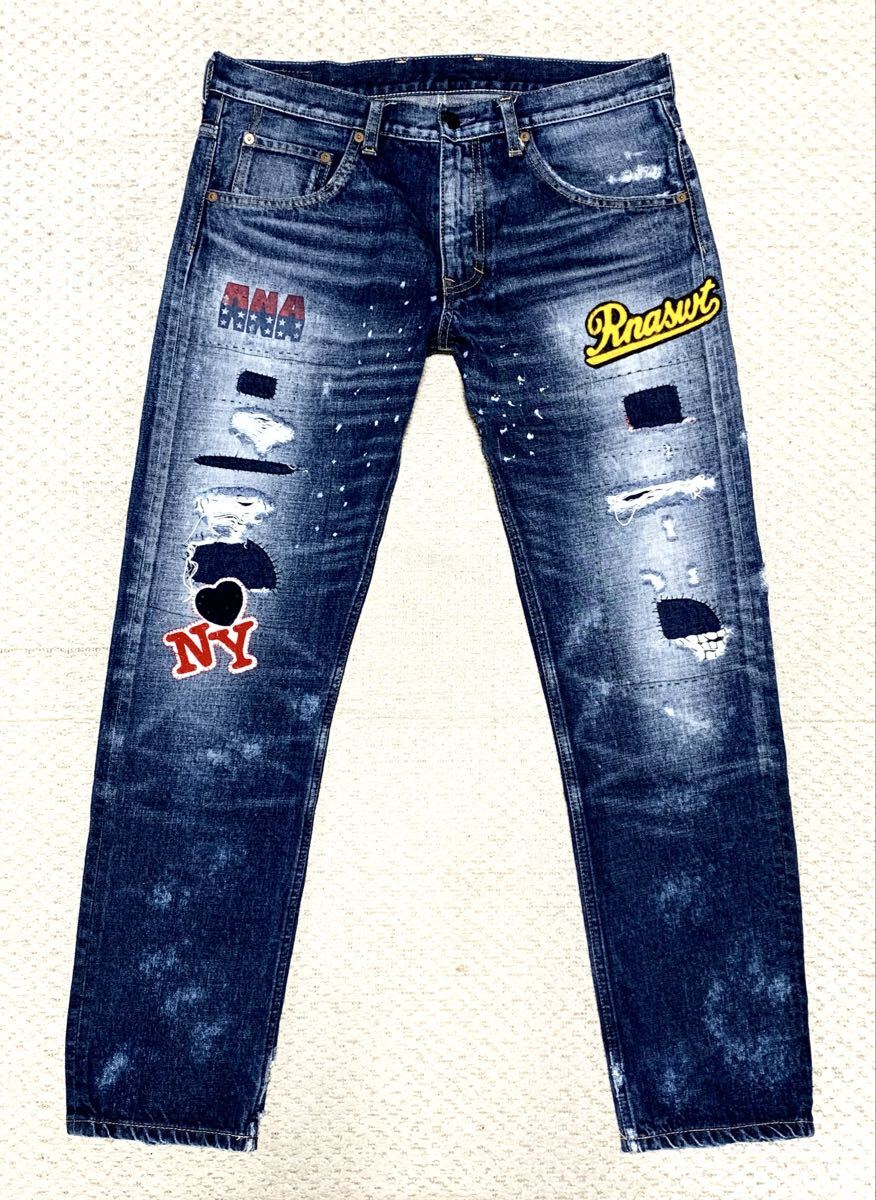 極上:RNA.テーパード デニム L(ワッペン&ペイント&リペア加工/綿100/W88H110股下80/パンク/V系/ロック系/milkboy glamb ヒスグラ type)