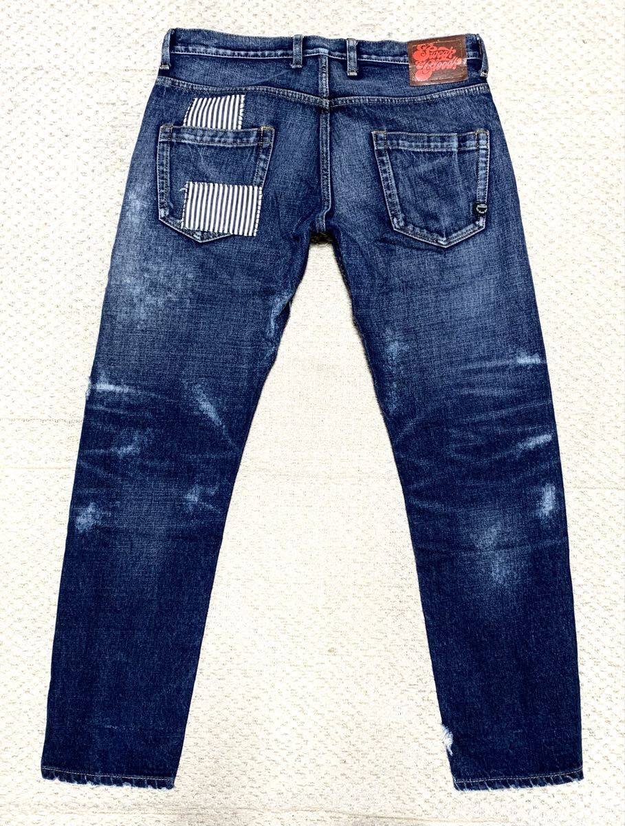 非常にリアルなUsed加工の他に、裏布(デニム)を充てたミシンリペア加工、若干のダメージ加工、若干のブリーチ剤飛ばし加工が施されていて、長年穿き込んだような雰囲気に仕上げられています。