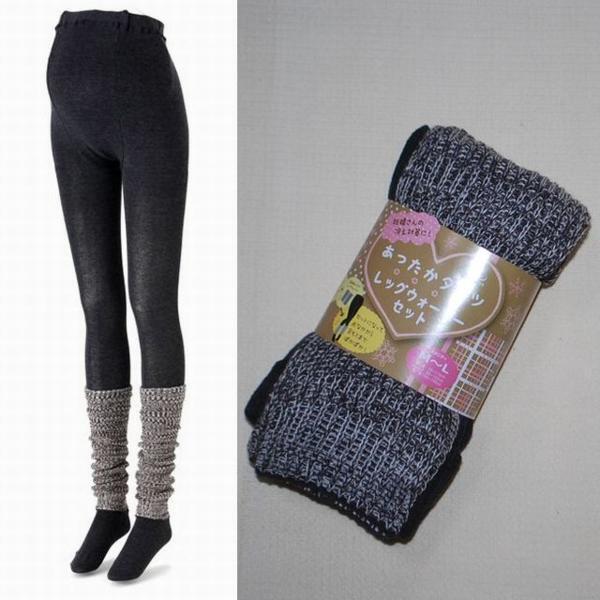 犬印本舗の、前後マチ付きで臨月までおなかにふんわりフィットするマタニティタイツ&あったか便利なレッグウォーマーのセットです。
