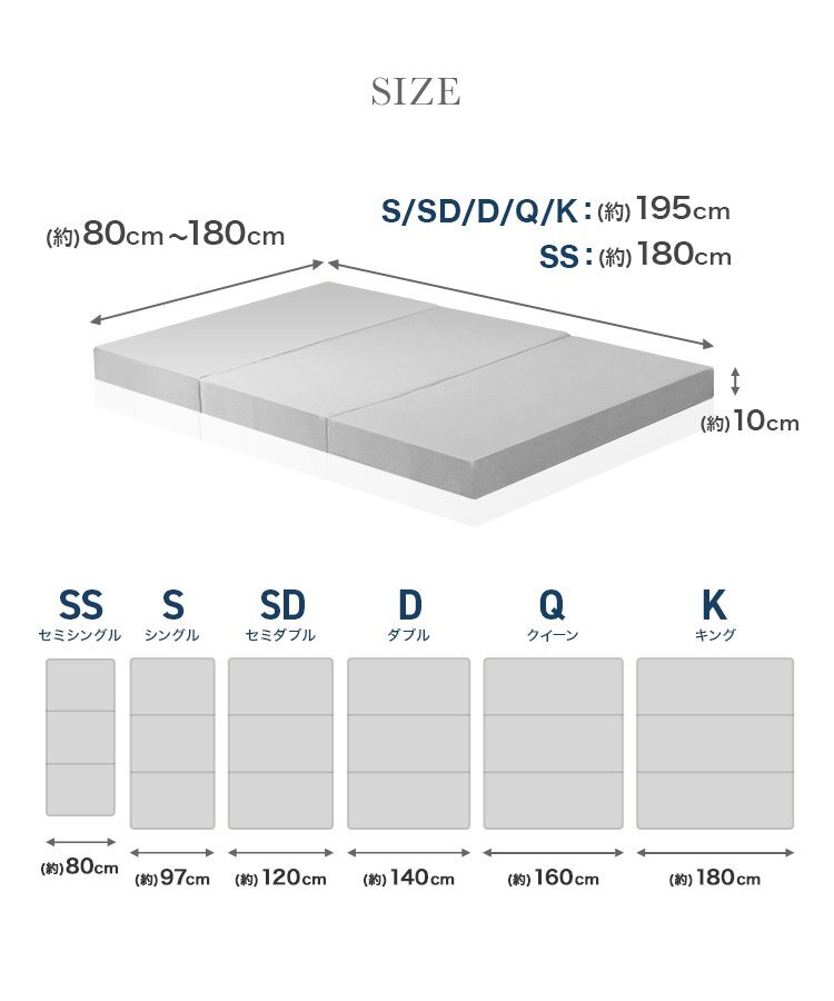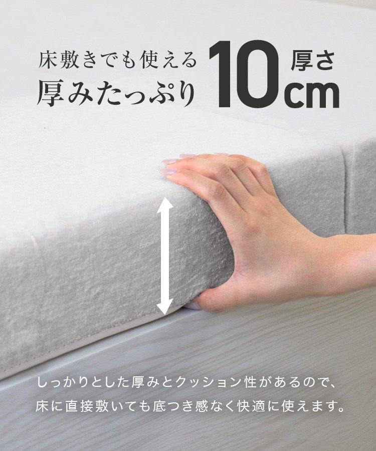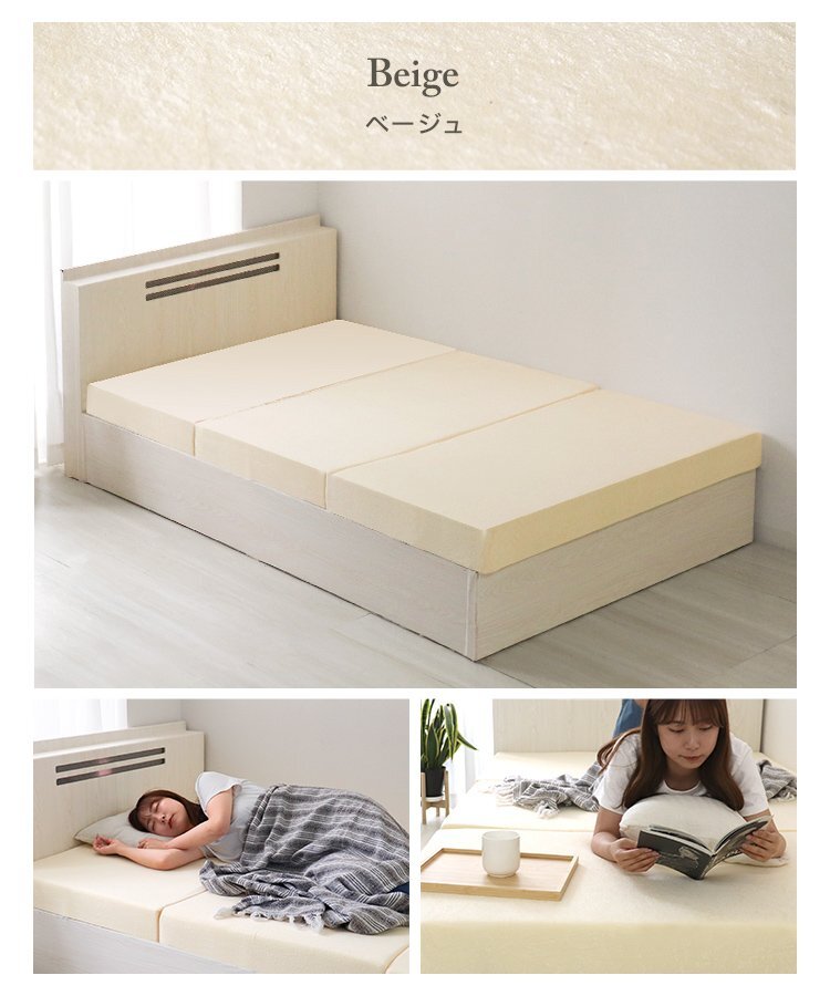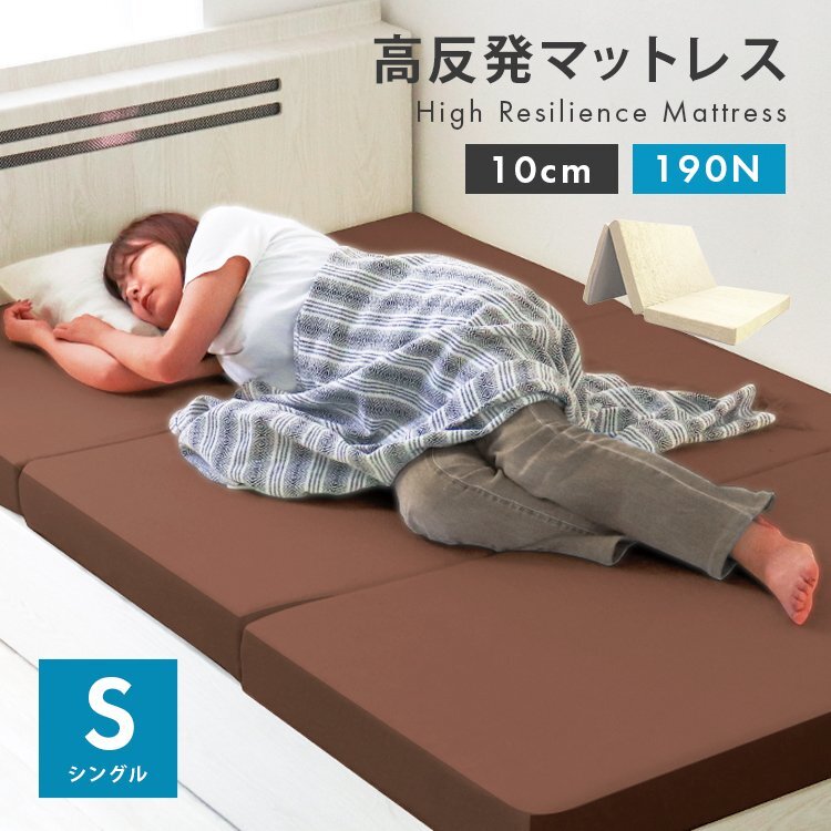 適度な硬さで身体をしっかり支える、三つ折りタイプの高反発マットレスです。 柔らかいマットレスとは違い、身体の沈み込みを軽減した腰に優しい寝心地です。 高反発マットレスのウレタンフォームは弾性が高く、適度な硬さで身体を支えるので、底つき感もなくへたりにくいマットレスです。 寝返りが多い方や仰向けに寝ることが多い方におススメです。 簡単にたためる三つ折りタイプなので、お部屋で立て置きして日当たりのいい場所で部屋干しが可能! 取り外しやすいL字ファスナー付き洗えるカバーが付属しています! 【商品仕様】 カラー:ブラウン、ベージュ サイズ(約):幅97cm×長さ195cm×厚み10cm(シングルサイズ) 折り畳み時(約):幅97cm×長さ65cm×厚み30cm 素材:高反発ウレタン 、パイル生地 他 硬さ:190ニュートン |